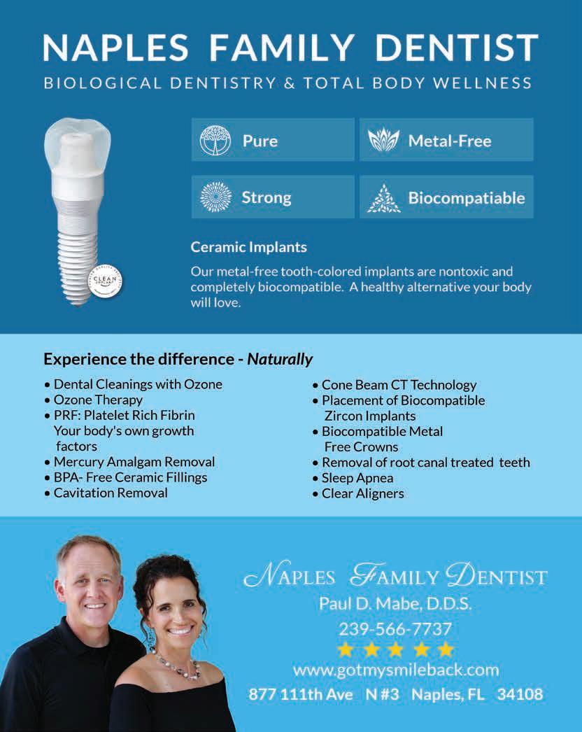 Biological dentistry for total-body wellness. Metal and toxin-free. Biocompatible Zircon Implants and metal-free crowns. BPA-free ceramic fillings. PRF: Platelet Rich Fibrin. Ozone Therapy. Sleep Apnea. See ad on back cover.