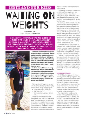 they move forward and progress in their sport—and life! “These initial movements and exercises on which we focus supplement—and eventually enhance—what they are already being taught in the water. At this point, we are not implementing strokespecific or event distance-specific dryland,” says Robinson. “Every young athlete benefits from the foundational movements, regardless of what event/distance they grow into. For example, improving coordination aids in activities such as the timing of kick and recovery in the butterfly stroke. Improving strength to body mass ratio increases velocity or distance per stroke. Joint stability focus helps in early health and protection of joints as water training increases. Body balance work assists in rotation and hip position in the water,” he says. “Foundational dryland is crucial to injury prevention. The ability to build strong shoulder retraction and decreased scapular upward rotation at a young age will minimize lost training time due to injury and result in long-term health benefits. “Whether it’s leap-frog relays or jumprope repetitions for time, such activities are simultaneously fun and challenging, providing a great opportunity to improve teamwork and competition. Building confidence, inspiring teamwork and increasing competition in a positive atmosphere is what builds the team here at NBAC,” says Robinson. BEGINNING DRYLAND At NBAC, beginning dryland training consists primarily of bodyweight activities, lightweight medicine ball routines, stretch cords, theraband schemes and remedial plyometrics. Those activities are maintained throughout an athlete’s age group career until reaching the senior group, at which time light dumbbell, heavier medicine balls and other external loads are added to their development. “I’ve implemented Bob Bowman’s in-water training philosophy of ‘capacity and utilization’ into our dryland,” says Robinson. “This means giving swimmers a wide base of exercise modalities that require movement mastery and proper coordination. We focus on true mastery of the movement before the athlete can progress to the next weight lifting/exercise skill.”