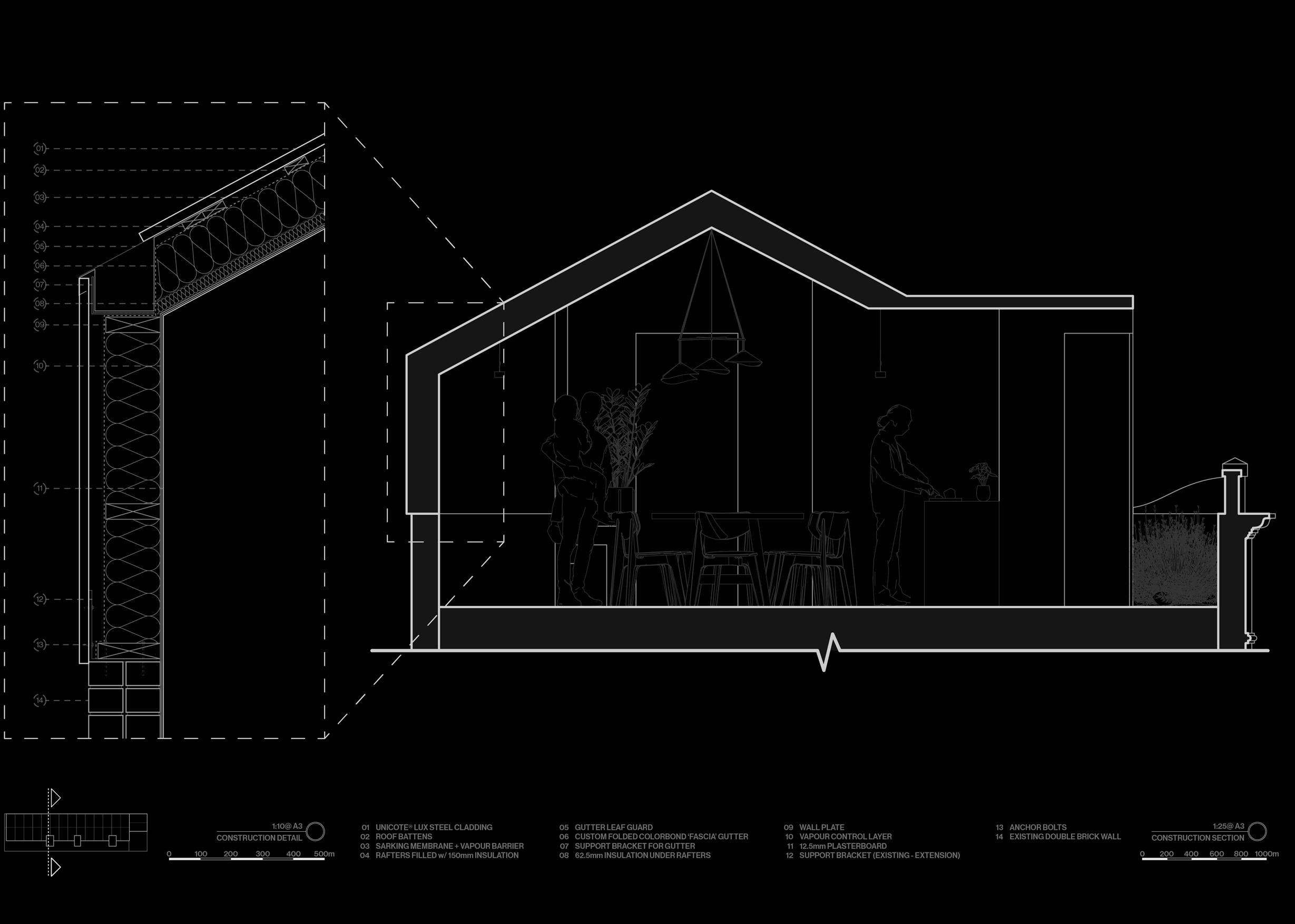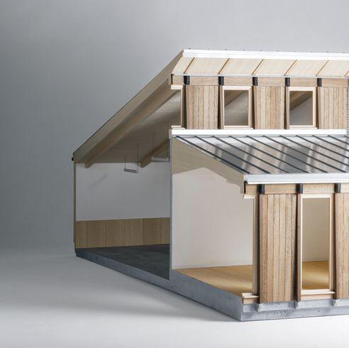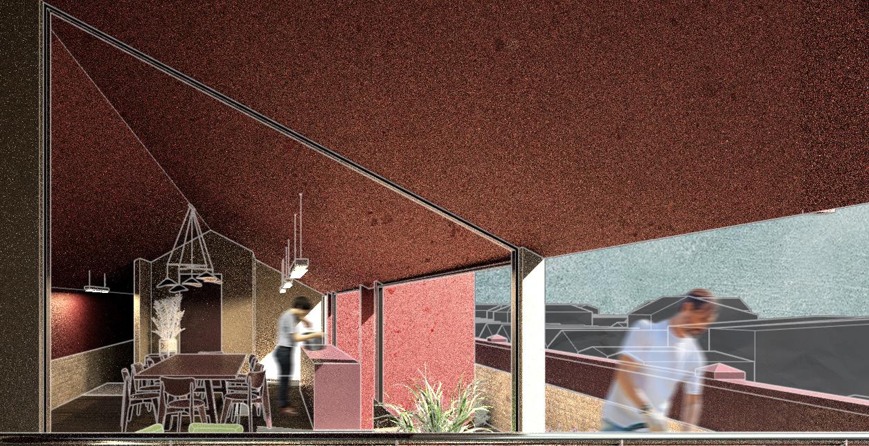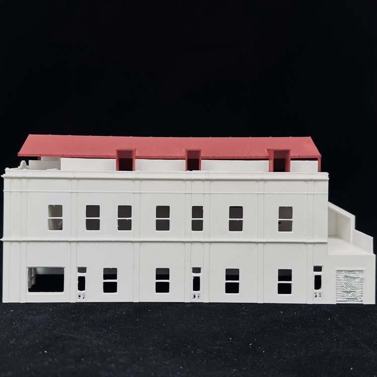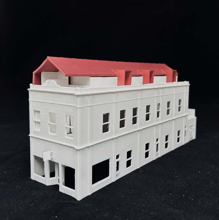 Finally a 1:100 scaled model was created for presentation purposes. The model was 3D printed and then spray painted with a plum red on the extension envelope to depict the finished corrugated metal roof.
