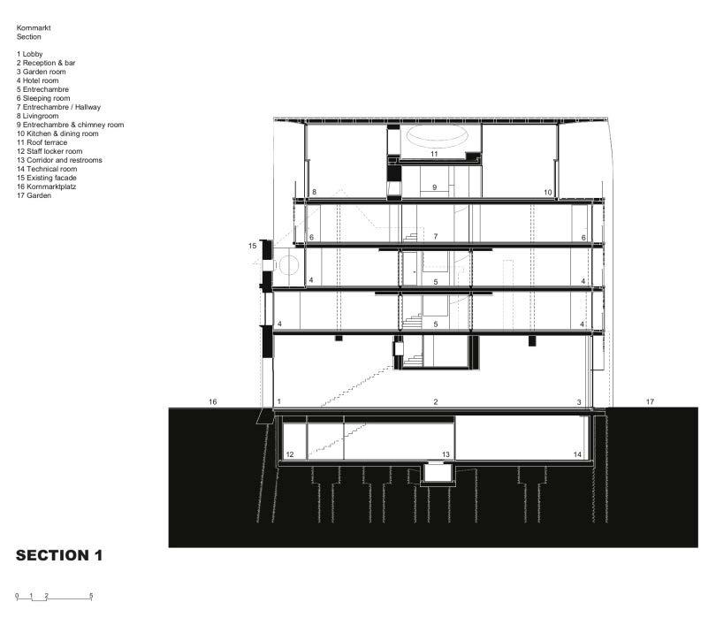 Herzog & de Meuron’s design preserves the building’s historic façade, ensuring it blends seamlessly with its surroundings. Behind this façade, they’ve introduced a modern five-story structure housing a small hotel, a cultural event space, and a private residence. This approach respects the building’s historical context while adding contemporary functionality.