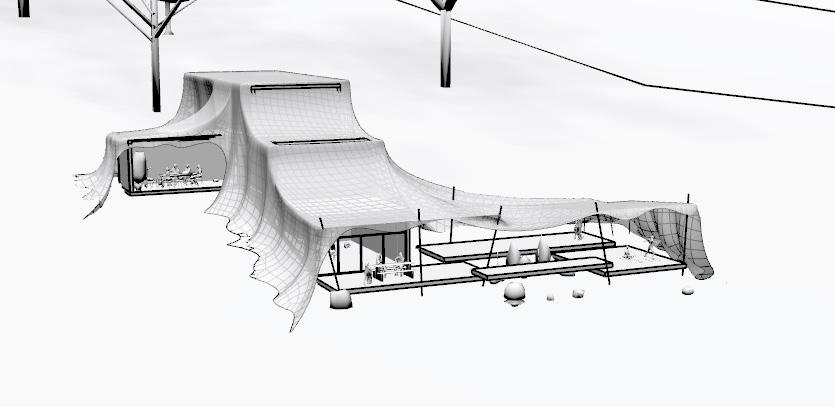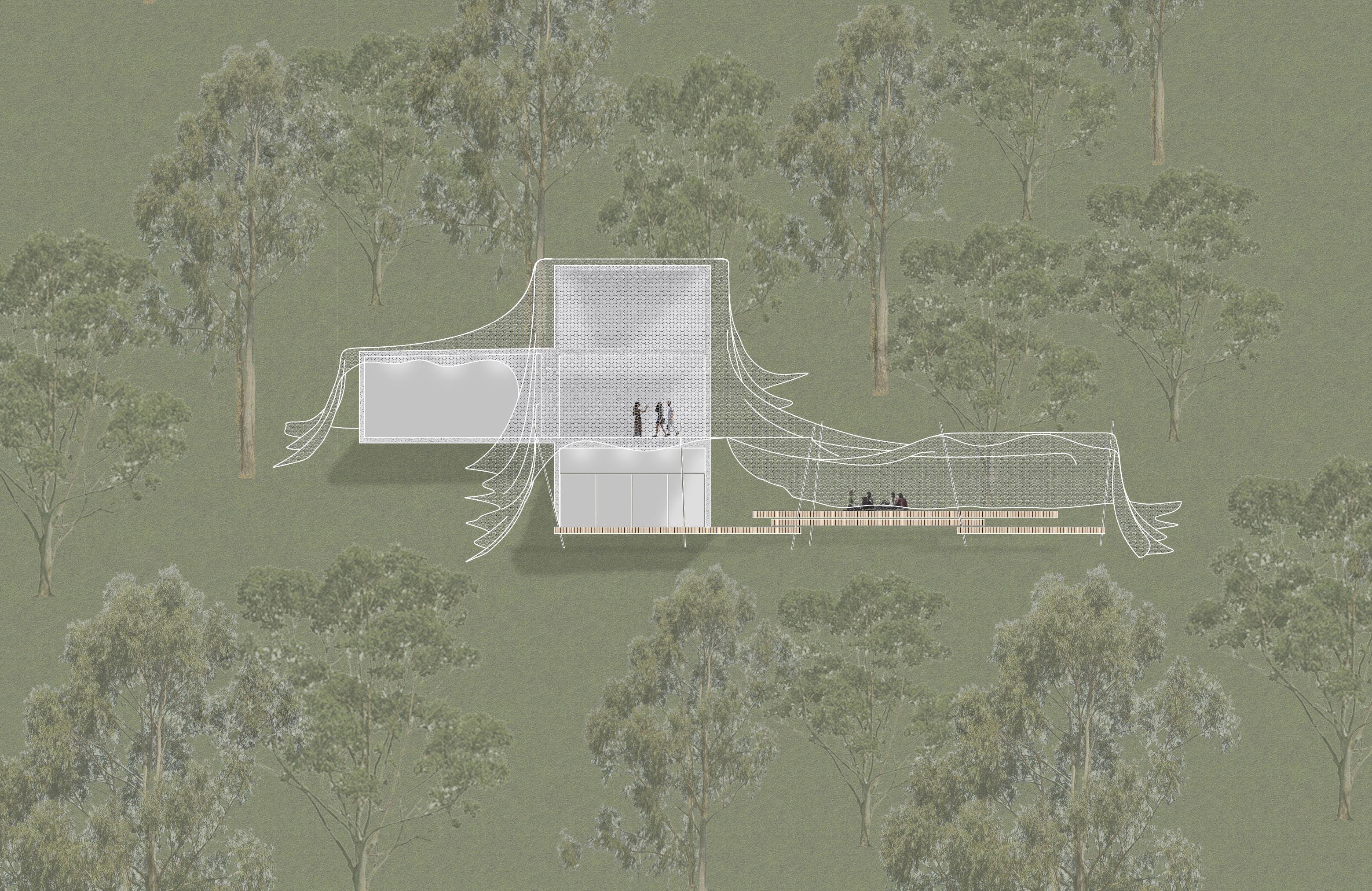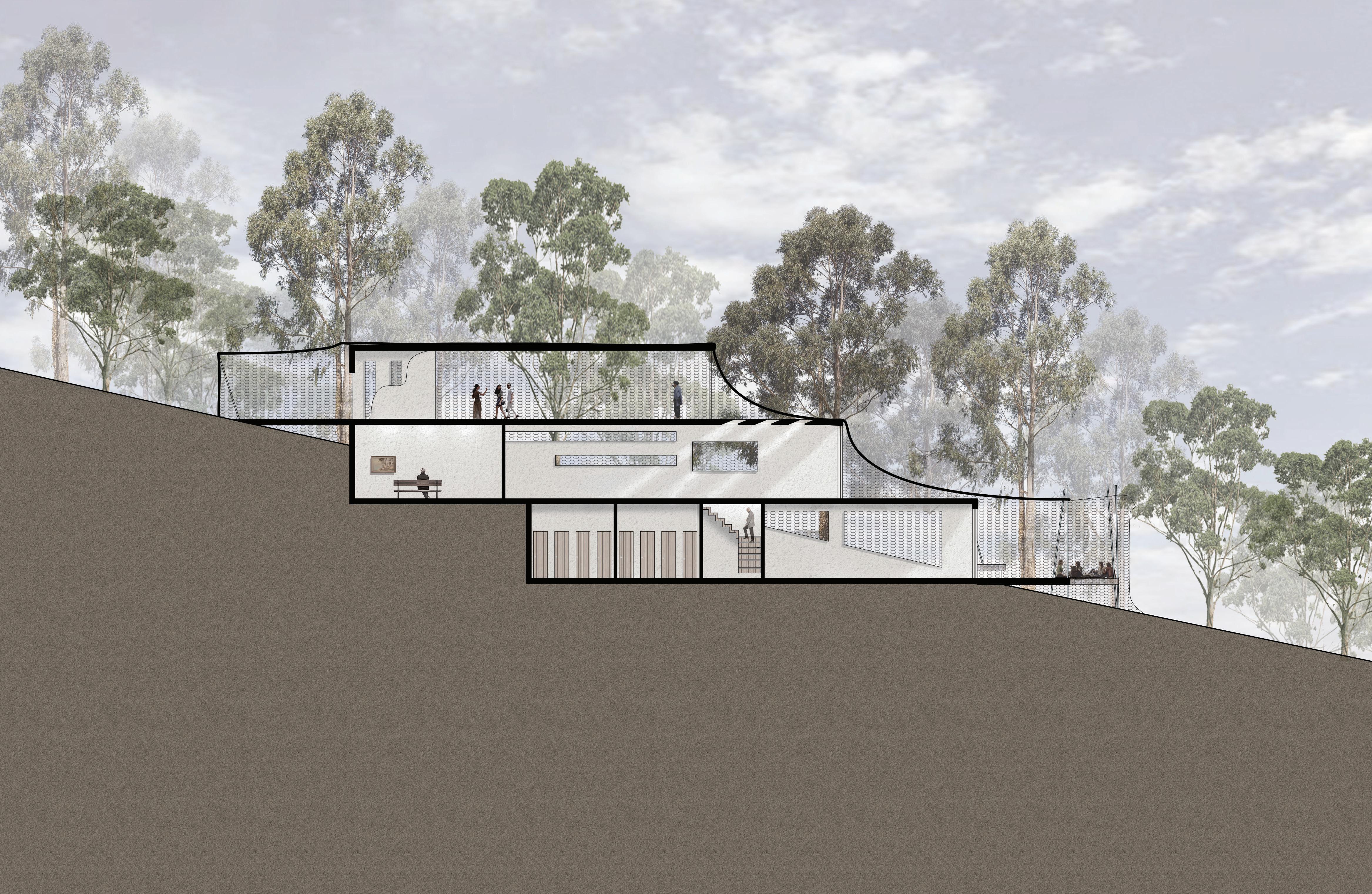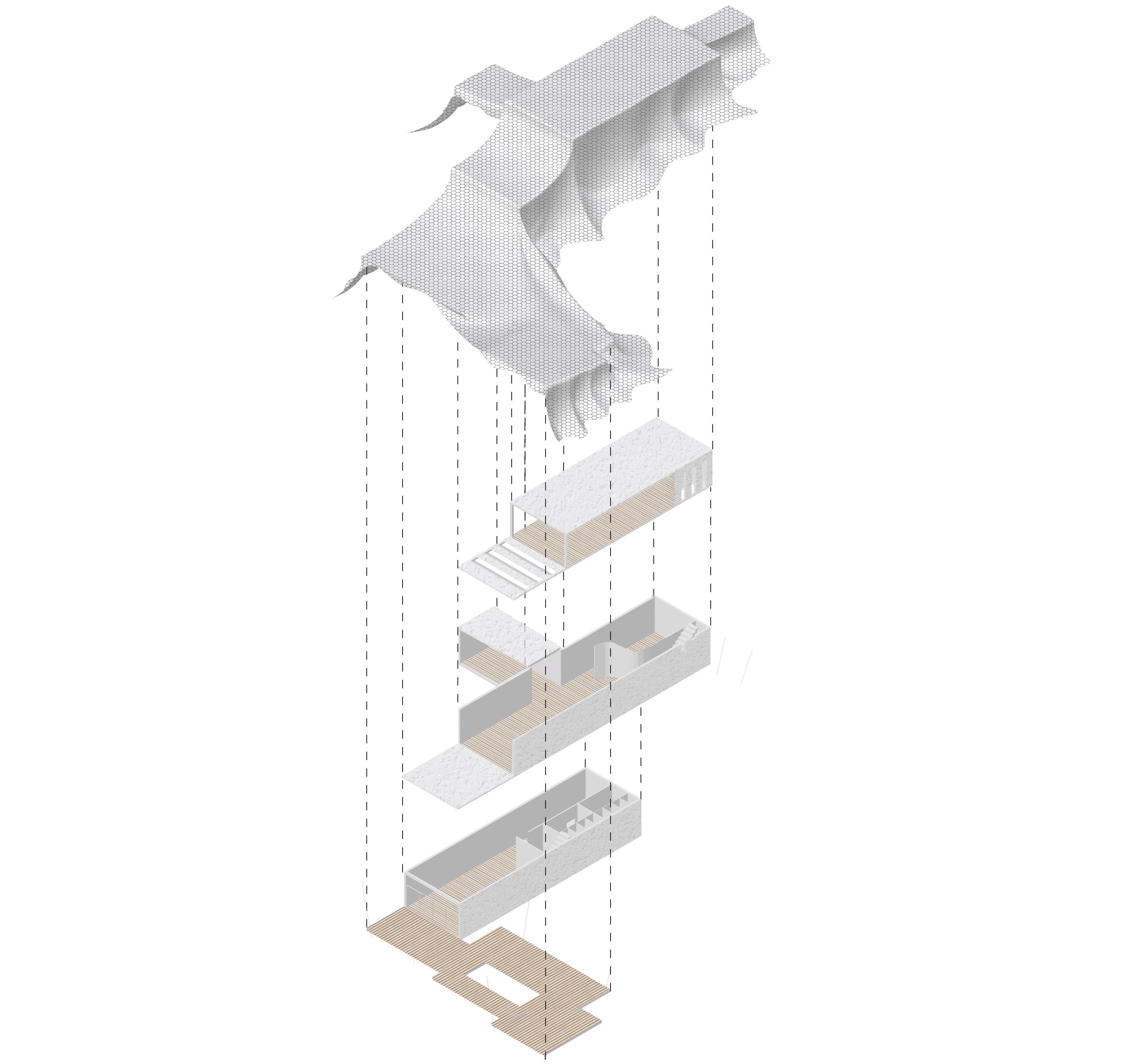The new structure has three levels ad seperates the napkin structure from the buildin, using it as a ‘fabric’ that is draped over the building form.