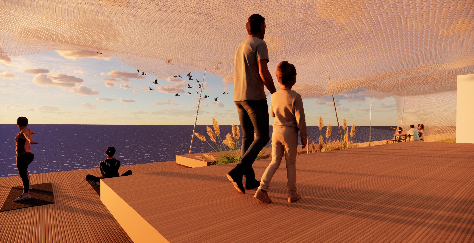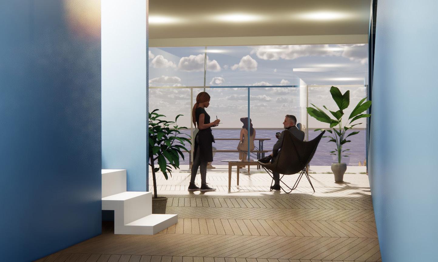 The decking where visitors can participate in yoga classes and enjoy the ocean views and fresh air.