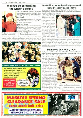 Sheila, James and Samantha Mitchell from Westlea have fond memories of meeting Queen Elizabeth the Queen Mother in May 1979 at Alliwal barracks at Tidworth garrison. The Queen Mother was ( colonel in chief of the 9th/ , i. 12th Royal Lancers and Y '' EF w+^ James met her on several occasions as Regimental Sergeant Major. In 1979 the Queen Mother visited to present a new Guidon (colours) to the regiment and Samantha, then three years old, had the honour of presenting ^ her with a bouquet. "It was a lovely day and a Y r': privilege to be in her corn pany," said Sheila who also attended the Queen Mother's centenary celebration pageant with James in 2000. Sheila making sure everything goes as "It is very sad to see the planned as Samantha presents her posy Queen Mother pass on. She Former Greendown student stood for everything good in this country and will be greatly Samantha is now a mother of two children and living in Rodbourne. missed."