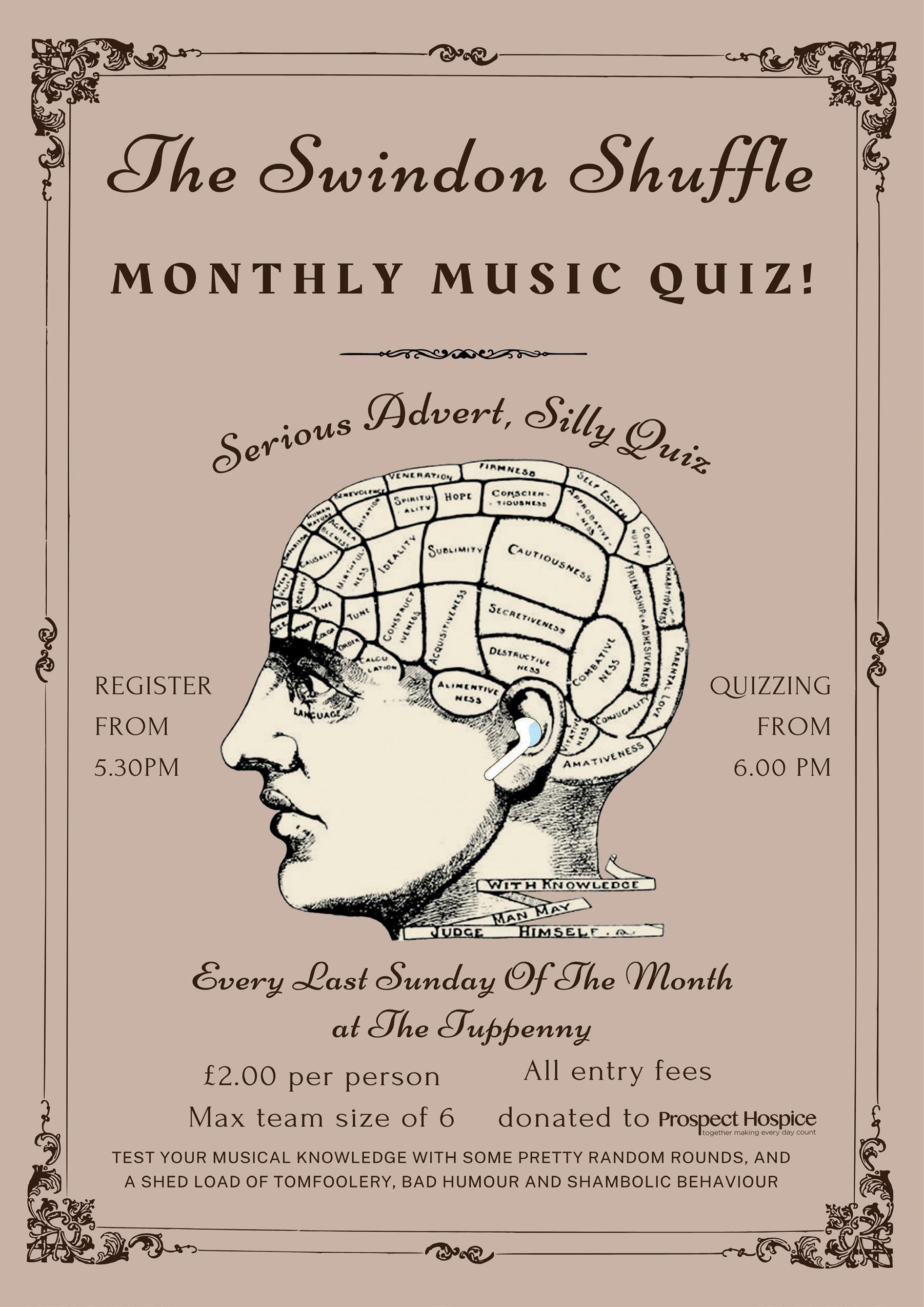 Team registration is from 7.30pm, with the quizzing from 8pm. It costs £2 per person, with max team sizes of 6. All entry fees go to Prospect Hospice, so you can feel warm and fuzzy as you quiz!