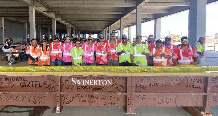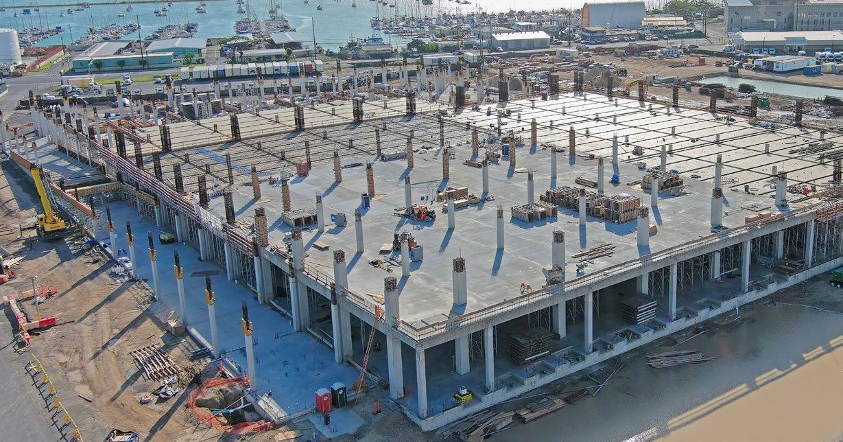 than precast concrete, which saved the client roughly $3 million. The cast-in-place concrete structure utilizes a Cunningham long-span beam forming system, allowing for expansive 45foot bays. Swinerton opted to self-perform the extensive structural concrete scope, marking the firm’s largest self-perform project in the State of Hawaii to date. A total of 118 Cunningham beams were prefabricated at Swinerton’s fabrication yard in Riverside, CA, and shipped across the Pacific Ocean with the formwork.
