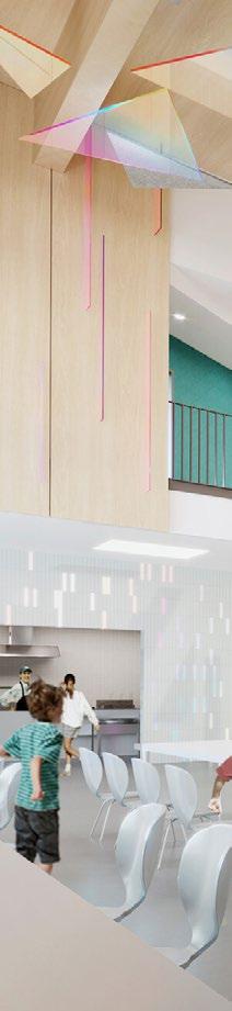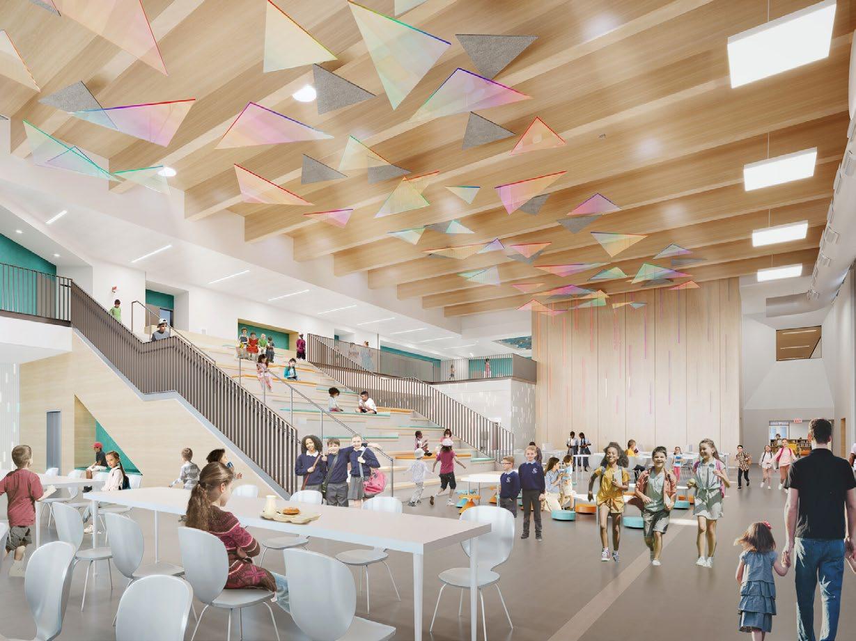 by replacing long-span steel joists with glued laminated timber (glulam) and cross-laminated timber (CLT) decking. The team also identified other strategic locations to use glulam and CLT, including the gymnasium and common area. The final design is highlighted by an exposed mass timber vaulted ceiling that spans an open two-story space.