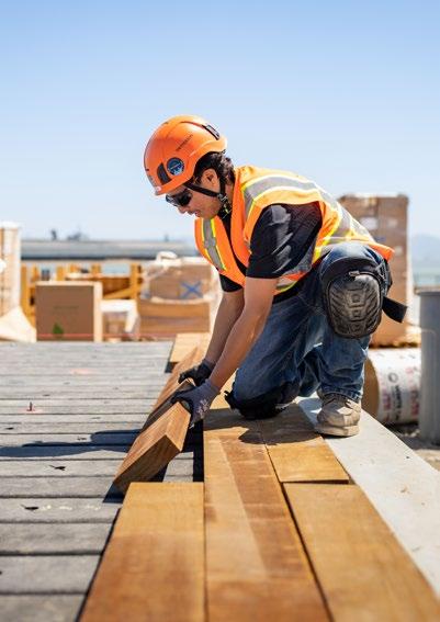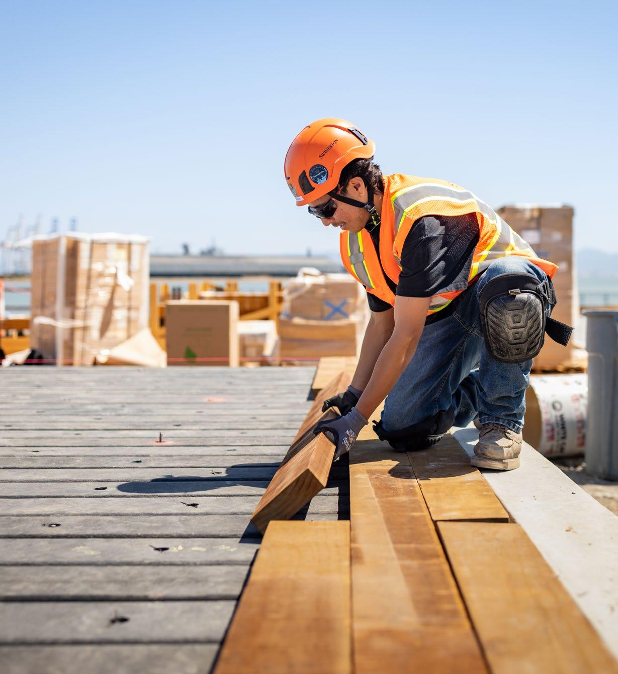 A craft professional lays wood planking at San Francisco’s newest waterfront park project, where Swinerton is selfperforming a significant volume of work.