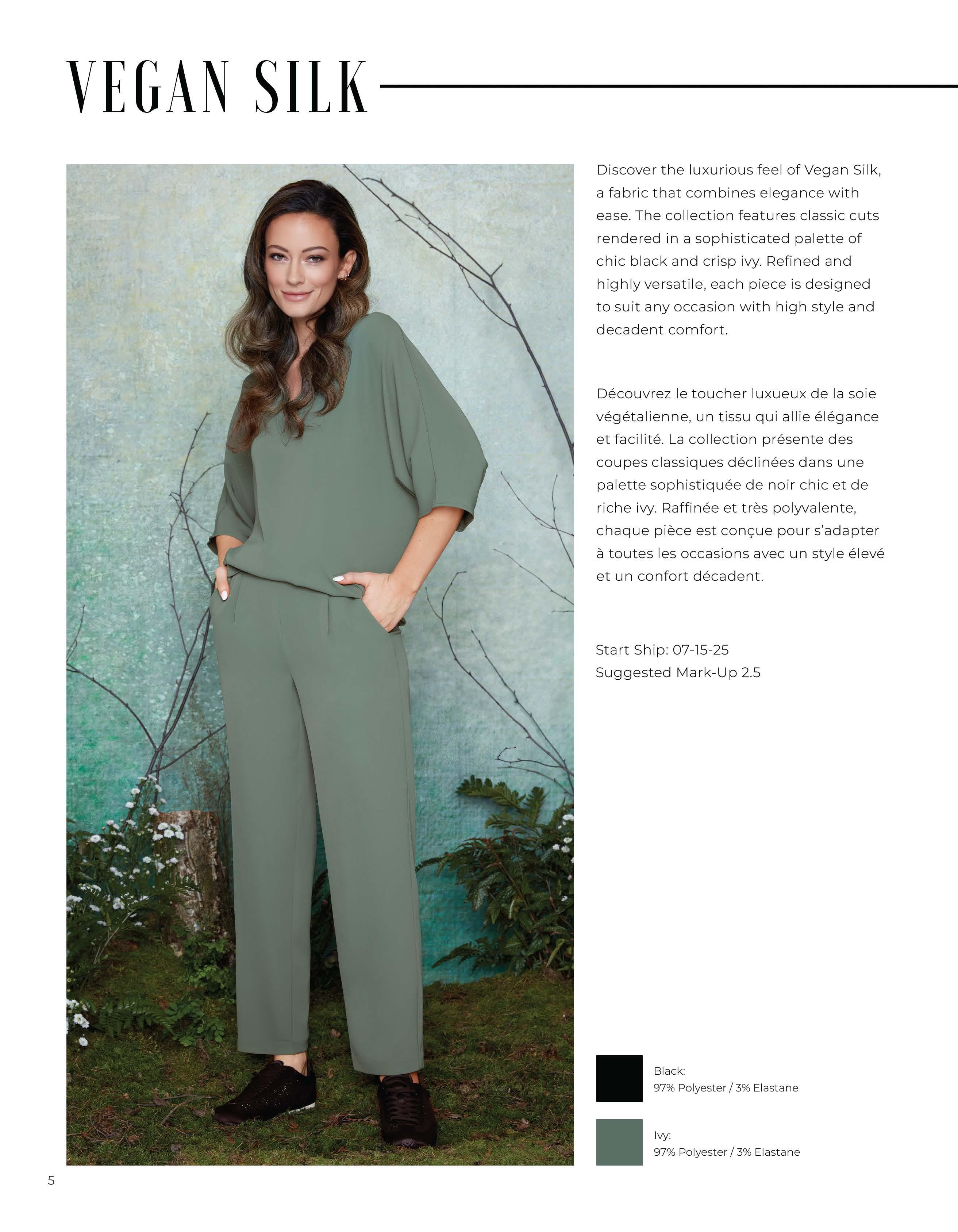 Discover the lu x urious feel of Vegan Silk, a fabric that combines elegance w ith ease. T he collection features classic cuts rendered in a sophisticated palette of chic black and crisp ivy. Refined and highly versatile, each piece is designed to suit any occasion w ith high style and decadent comfort