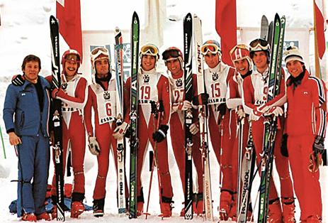 de Völkl réunies: Anita Wachter, Walter Tresch, Hanni Wenzel, Maria Walliser et Peter Lüscher (de g. à dr.).