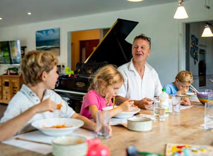 Doch die Idylle ist trügerisch. Im Hause Schönbächler ist ständig etwas los. Die Betreuung seiner vier Kinder aus der zweiten Ehe, vom Teenager bis zur Achtjährigen, teilt er sich mit seiner Ex-Frau. Das bedeutet: die Älteste zum Reiten fahren, auf die Hausaufgaben achten, kochen, von der Schule abholen – oder die Fussball-Juniorenmannschaft des zweitältesten Sohnes trainieren. Seit Anfang August wohnt zudem die Lehrtochter im Gästehaus der Familie, die sich im Somasana zur Fachfrau Bewegungs- und Gesundheitsförderung ausbilden lässt. Seine zwei Kinder aus der ersten langjährigen Partnerschaft sind inzwischen erwachsen und ausgezogen.