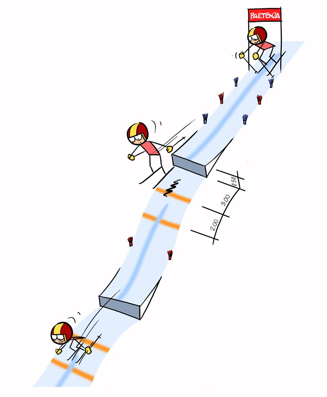 Adattare il percorso alle capacità e all’età dell’allievo/a – sciare attorno a 8 12 porte da slalom gigante (paletti, mini paletti, coni) a 8 – 15 metri di distanza l’uno dall’altro con un solo sci ai piedi – esercitare entrambe le gambe.