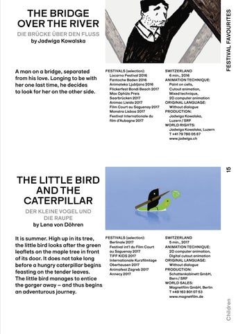 SWITZERLAND 5 min., 2017 ANIMATION TECHNIQUE: 2D computer animation, Digital cutout animation ORIGINAL LANGUAGE: Without dialogue PRODUCTION: Schattenkabinett GmbH, Bern / SRF WORLD SALES: Magnetfilm GmbH, Berlin T +49 163 801 07 53 www.magnetfilm.de