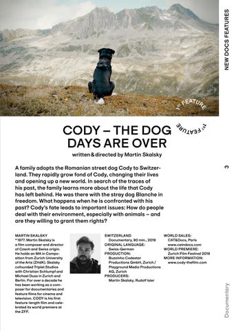 A family adopts the Romanian street dog Cody to Switzer land. They rapidly grow fond of Cody, changing their lives and opening up a new world. In search of the traces of his past, the family learns more about the life that Cody has left behind. He was there with the stray dog Blanche in freedom. What happens when he is confronted with his past? Cody’s fate leads to important issues: How do people deal with their environment, especially with animals – and are they willing to grant them rights? WORLD SALES: SWITZERLAND CAT&Docs, Paris Documentary, 90 min., 2019 www.catndocs.com ORIGINAL LANGUAGE: WORLD PREMIERE: Swiss-German Zurich Film Festival 2019 PRODUCTION: MORE INFORMATION: Buzzinho Codestar www.cody-thefilm.com Productions GmbH, Zurich / Playground Media Productions AG, Zurich PRODUCERS: Martin Skalsky, Rudolf Isler