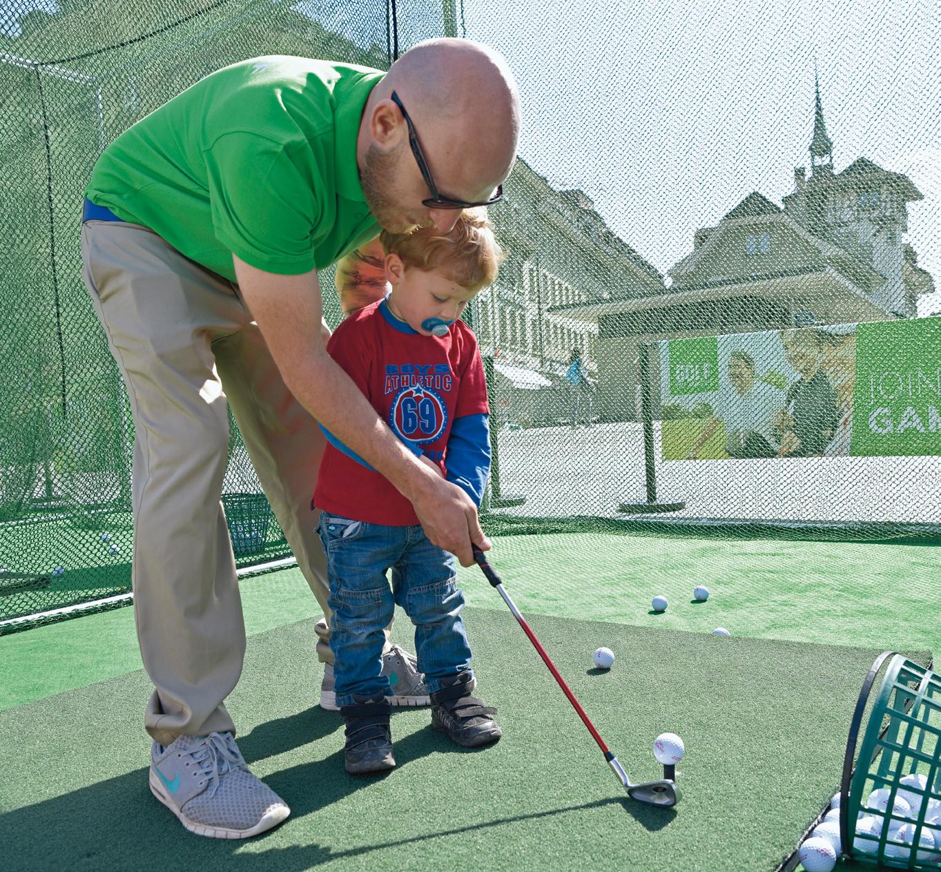 Le président du Conseil national, Jürg Stahl, dans son bureau et sur le putting green lors du City Golf Tour à Berne.