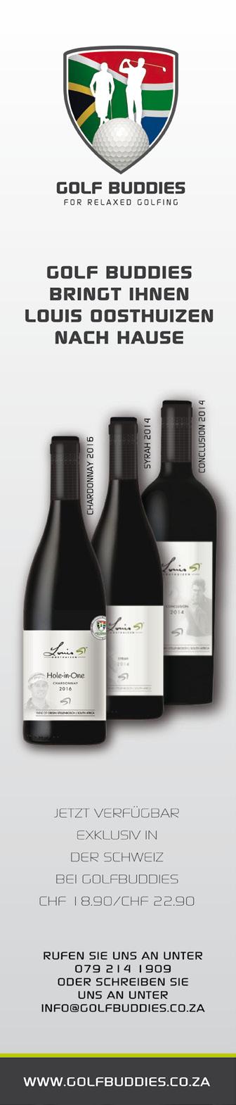 organisent des voyages sur mesure en Afrique du Sud. «L’activité a connu un fort développement», déclarent-ils. Aujourd’hui, le couple a encore d’autres idées. Grâce aux bons contacts avec la direction de Louis Oosthuizen, le célèbre professionnel du golf sud-africain, Golf Buddies a pu importer en Suisse les meilleurs vins de la Louis Oosthuizen Private Collection. Le «Conclusion 2014» est un mélange de Cabernet Sauvignon, Cabernet Franc et Merlot conservé dans des fûts de chêne français pendant