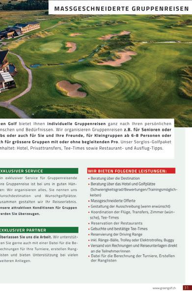 Ce tour exceptionnel est une première en Suisse. Composez vous-même votre circuit de golf inoubliable parmi douze parcours de golf divertissants et quatre attractions touristiques spectaculaires dans les Grisons, la plus grande destination golfique de Suisse.