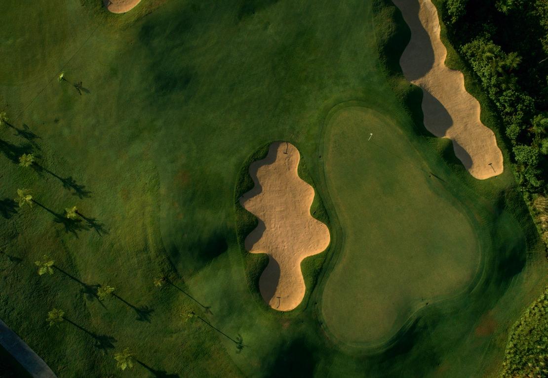 Dogleg nach rechts, auf Wunsch von Seve Ballesteros korrigiert worden ist. Der Platz ist hügelig, äusserst gut gepflegt und technisch anspruchsvoll. Das zähe Bermudagras ist eine zusätzliche Herausforderung. Die Hindernisse sind strategisch perfekt platziert; auf dem Dogleg der 8 sieht man nun tatsächlich das Grün. Am 15. Loch, dem Par 3 Signature Hole, zückt jeder sein Smartphone, um den wunderschönen Ausblick festzuhalten. Vom hochgelegenen Abschlag (196 Meter von den hinteren Tees) muss die weite Lagune überspielt werden, um das in einer idyllischen Lichtung gelegene Grün zu erreichen. Ganz einfach herrlich! Die zahlreichen Enten, die die Lagune bevölkern, verstärken den Eindruck einer nach wie vor intakten Natur.