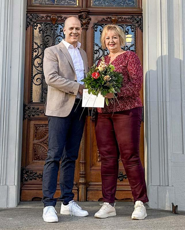 Le directeur de la FSG, Stefan Riner, surprend Sonja Moeri avec un bouquet de fleurs à l'occasion de sa 40e année de service.