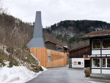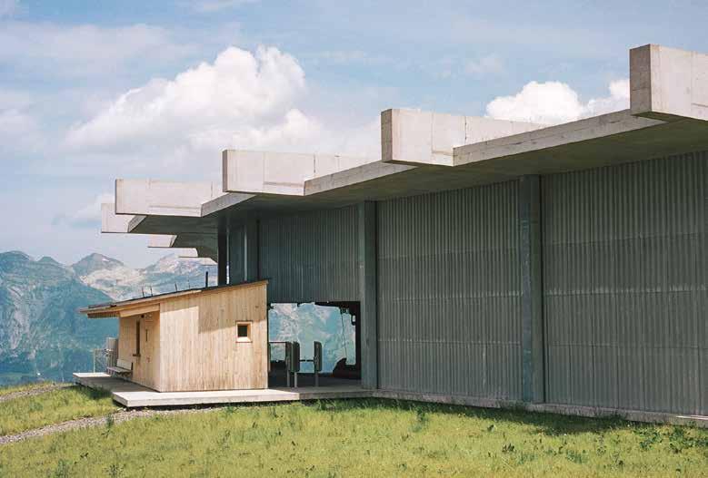 les proportions d’un palazzo et suggèrent, grâce aux plaques s’élargissant potentiellement sans limite, une impression d’infini. Les jambages inclinés qui supportent les rives en panneaux Duripanel renforcent l’impression de verticalité, tout en créant, en association avec la couronne du bâtiment en porte-àfaux une terminaison évoquant un palazzo classique. Sur la dalle de sol en béton coulée directement sur la roche furent créées des nervures en saillie, destinées à porter des poteaux en bois. Des consoles, sur lesquelles sont vissés les panneaux Duripanel allongés ou dressés, y sont fixées. Elles ont pour rôle de protéger de l’humidité les caissons d’isolant posés à l’arrière, tout en assurant la ventilation. Cette construction, en raison de l’alternance d’éléments porteurs perpendiculaires et d’éléments portés longitudinaux, évoque un empilement de planches. Cette stratification souligne également sur le plan formel le stockage des marchandises à l’intérieur de la halle. La façade associe les rôles d’une structure et d’une forme. Le regroupement de ses éléments engendre une entité compacte. La paroi est à la fois la somme des matériaux qui la composent, une enveloppe et un espace.