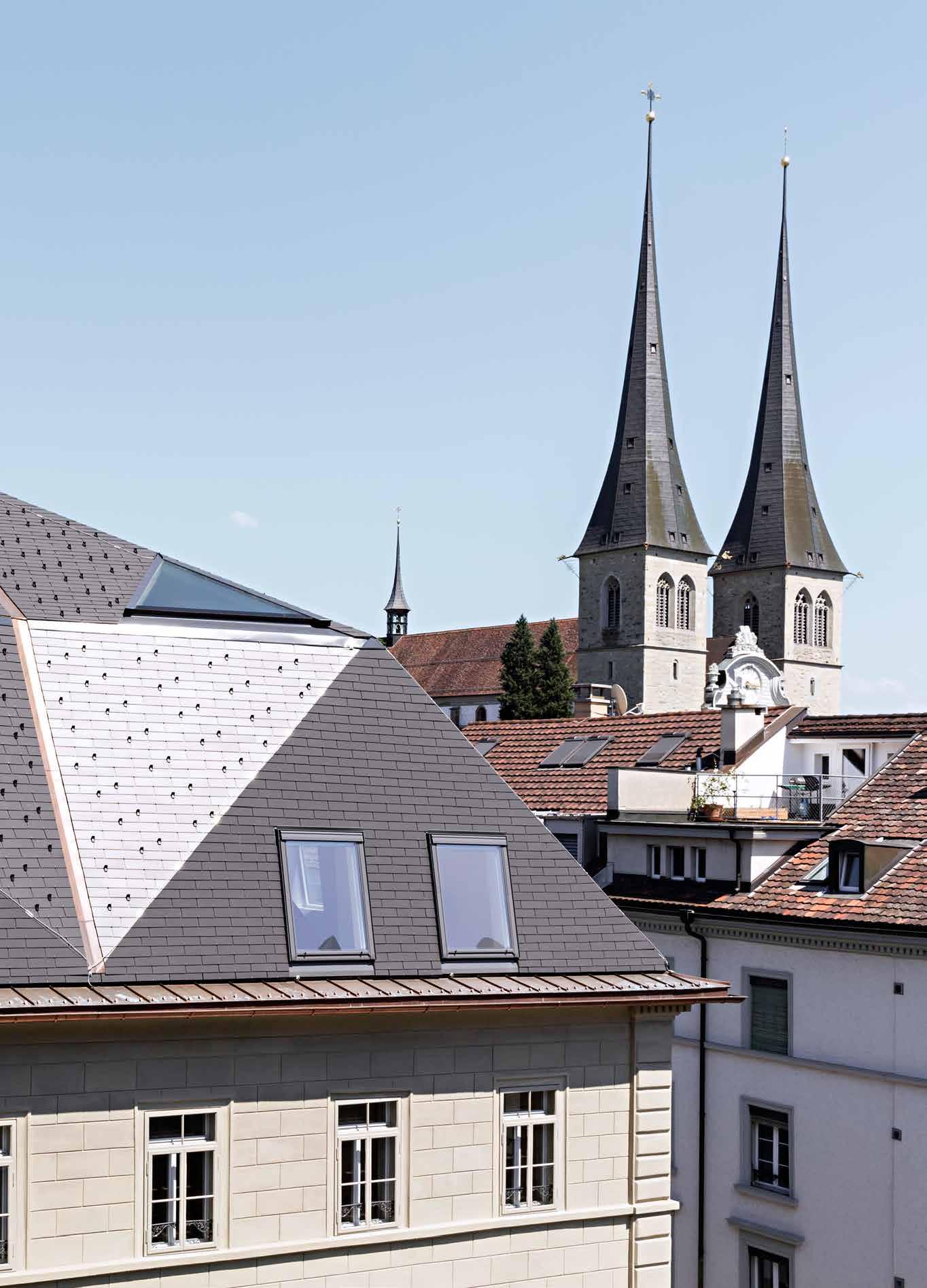 Les architectes ont transformé l’ancienne « Pension Felder » à Lucerne en immeuble résidentiel dans le respect des règles de la conservation, en lui ajoutant une toiture plissée.
