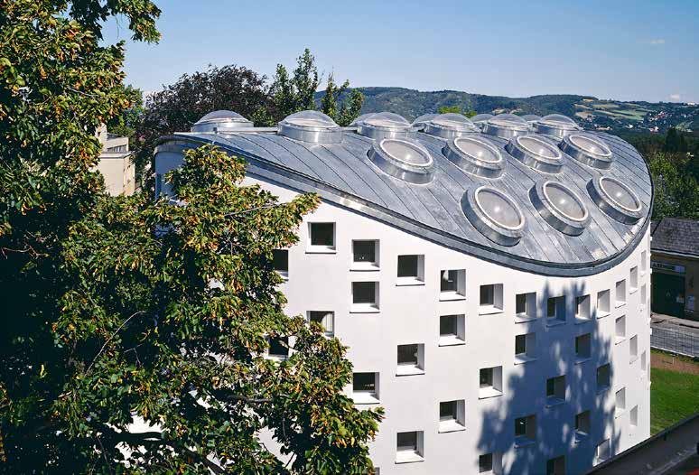 Bouclier à tétons: Heinz Tesar a doté la toiture de l’église évangélique Klosterneuburg de nombreuses coupoles destinées à l’éclairement (1995).