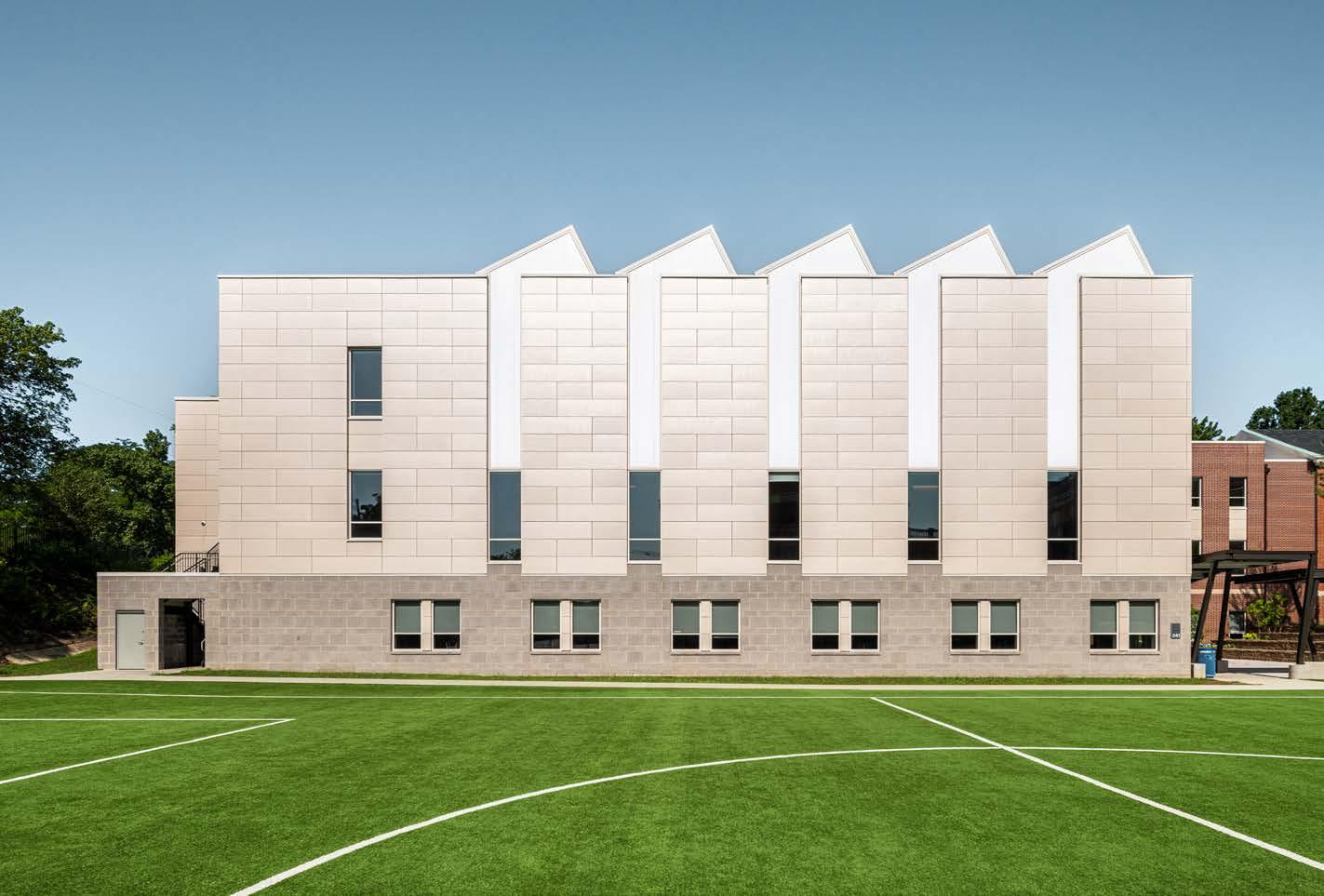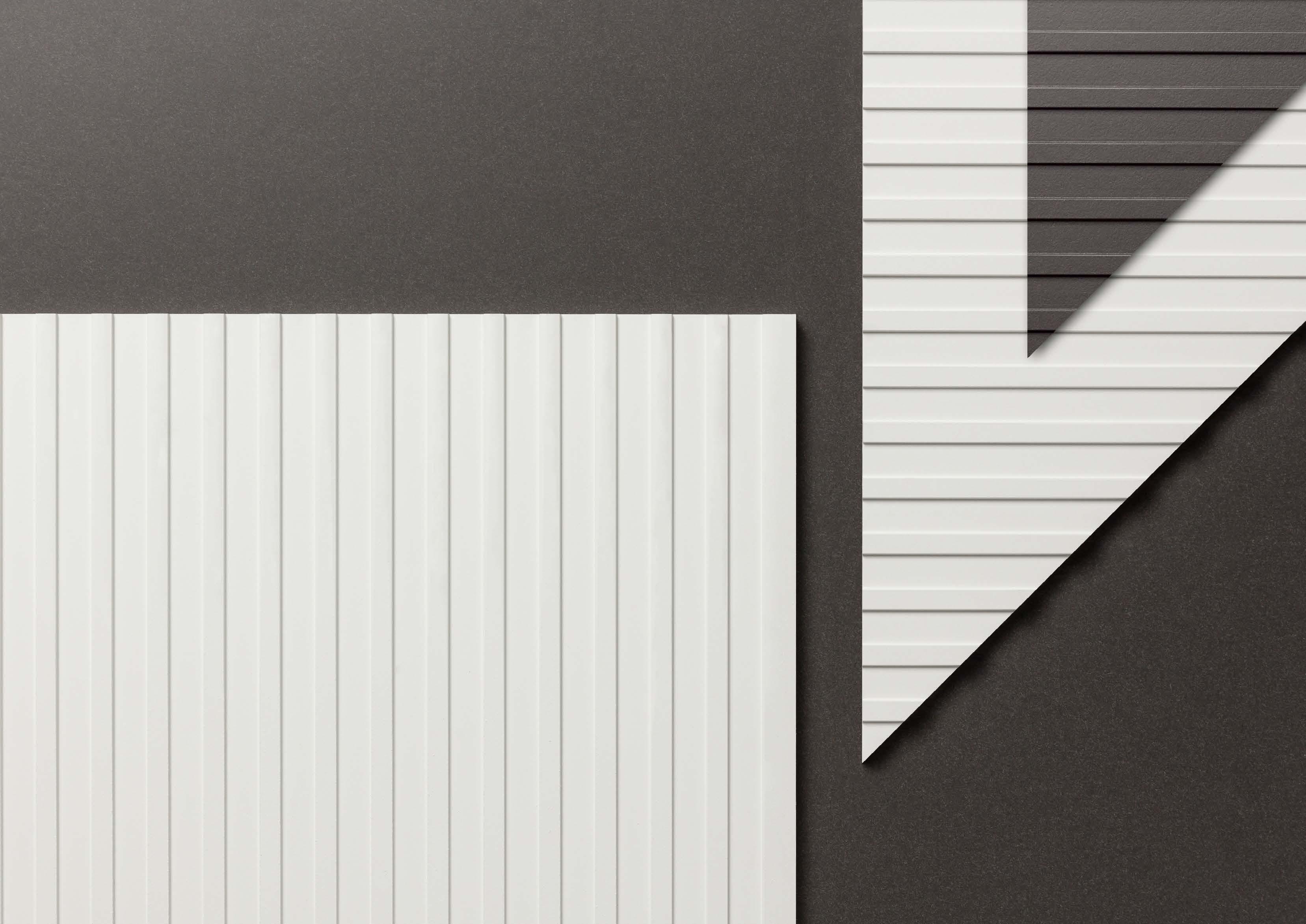 Homogeninės plokštės su linijiniais išfrezuotais struktūriniais grioveliais. Tai suteikia pastatui unikalų 3D efektą ir dinamišką vaizdą. Plokščių paviršiai iš visų pusių yra hidrofobizuoti.