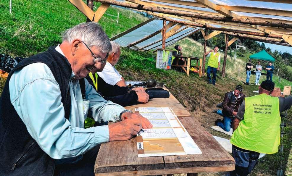 Unechaleur étouffantede30degrés, presque pas de vent, pas de matelas moelleux, mais des copeaux de bois recouverts d’une couverture et aucune protection contre les caprices de la météo. Voilà àquoi ressemble le tir en campagne de l’Obertoggenburg. L’auteur de cetarticle peuttout de même se réjouir de l’accompagnement attentionnédujeune tireurGregorGeisser. Le jeune talent du tir explique patiemment les particularités de ce«véritable» tir en campagne: des cibles à300m de distance, scintillant danslachaleur,àpeine numérotées. Avant chaque tir, il faut donc d’abord trouver la bonne cible. Mais un incident survient: au premier commandement, le cibarre indique un