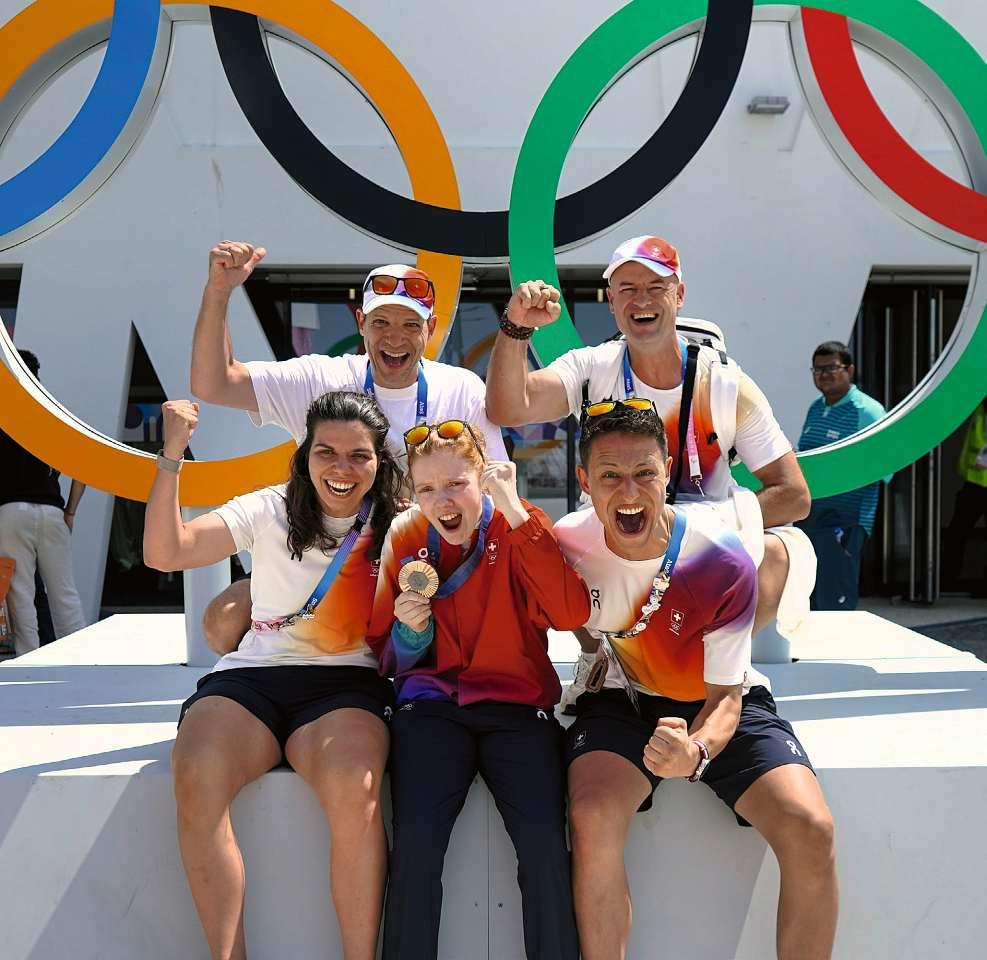Un momento speciale della cerimonia èstato l‘omaggio ai medagliati olimpici svizzeri viventi. ChiaraLeone, AudreyGogniat, Nina Christen, HeidiDiethelm Gerber,Michel AnsermeteDaniel