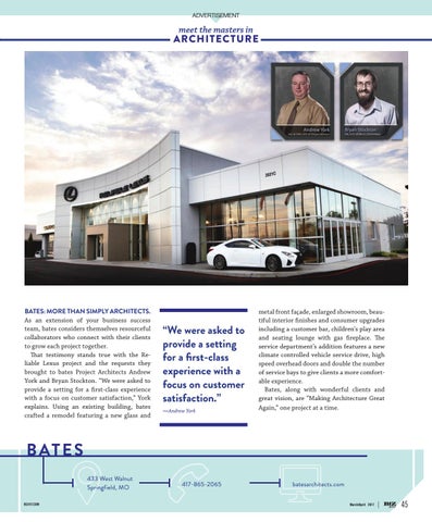 metal front façade, enlarged showroom, beautiful interior finishes and consumer upgrades including a customer bar, children’s play area and seating lounge with gas fireplace. The service department’s addition features a new climate controlled vehicle service drive, high speed overhead doors and double the number of service bays to give clients a more comfortable experience. Bates, along with wonderful clients and great vision, are “Making Architecture Great Again,” one project at a time.