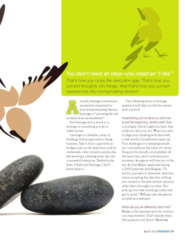You don’t need an idea—you need an “I did.” That’s how you close the execution gap. That’s how you convert thoughts into things. And that’s how you convert experiences into moneymaking wisdom. s much, leverage must become an essential component to your entrepreneurship lexicon. Leverage is “increasing the rate of return from an investment.” But leverage isn’t a word or a strategy or something you do to make money. Leverage is a lifestyle, a way of thinking, and an approach to doing business. Take it from a guy with no background, no job experience and no credentials—who turned a simple idea like wearing a nametag every day into a successful enterprise. Twelve books later, if that’s not leverage, I don’t know what is.