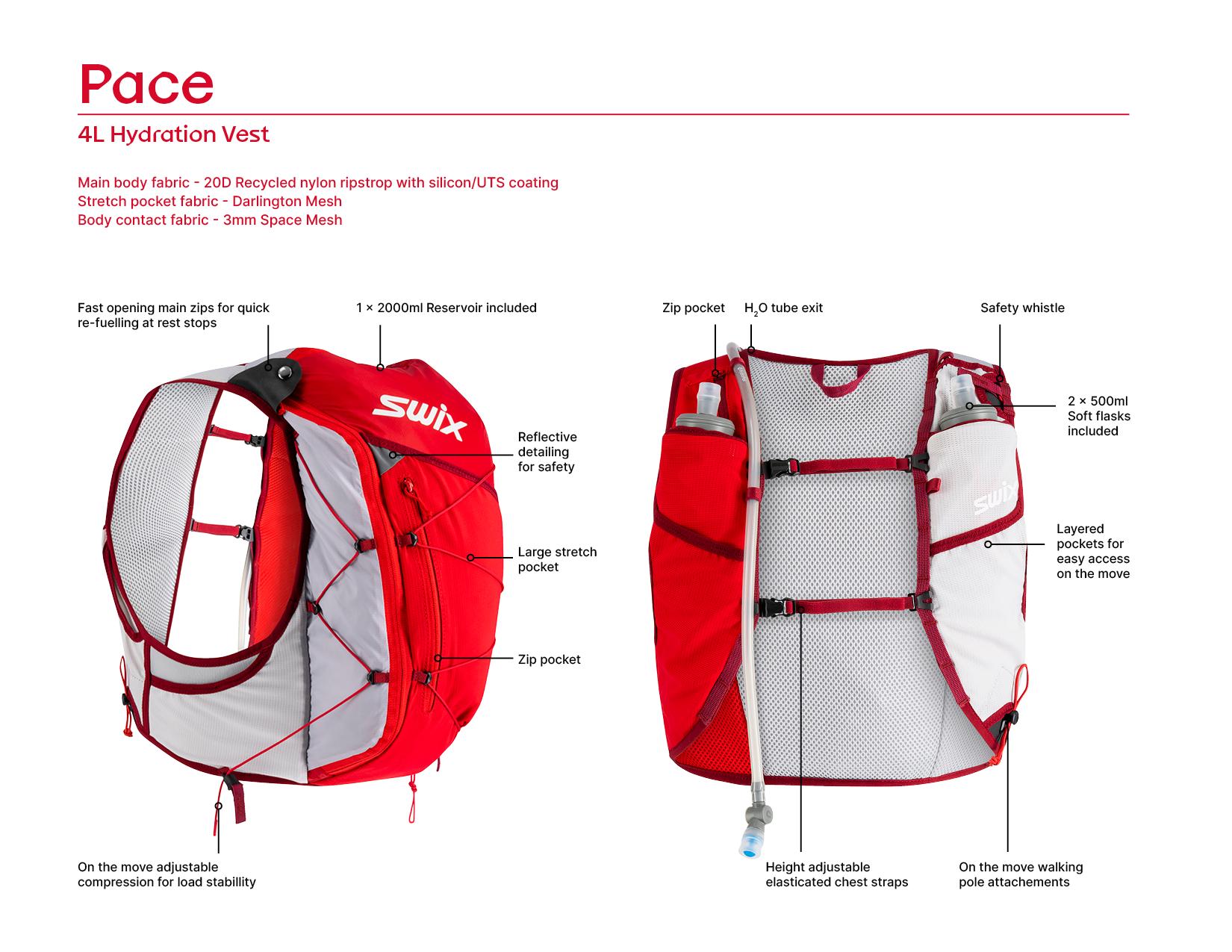 This is a 12 liter pack designed for cross activity The ha ness includes fast wicking mate ials for moisture management and comfo t The Escape uses lightweight mate ials to minimize weight and allow you to go fu ther and faster for the same energy. This fully featured daypack includes a front zip pocket for secu ing gear, a large inside zip accessed compa tment. The hipbelt includes two stretch zip pockets for easy access to kit on the move Comfo table load ca iage is provided by the padded & breathable air mesh shoulder straps and adjustable waist belt. Side bottle pockets give easy access to hydration on the go. Breathable molded lightweight back suppo t, hydration sleeve with inside clip to add your accesso ies. Main fab ic 70D nylon, nylon spandex Lining 70D nylon, polyester air mesh