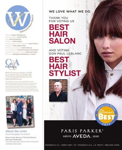 409 W. 21st Avenue, Covington, LA 70433 Phone: 985-893-7350, Fax: 985-893-7686 e-mail: editor@sophisticatedwoman.com SophisticatedWoman.com © 2014. All rights reserved. No part of this publication may be reproduced without permission of the publisher. Views expressed are not necessarily shared by the publisher or staff of this publication. All attorney features and display ads in this issue are paid advertisements. Please mail comments or submit articles and photographs for Around Town to the above address. If you wish to be mailed a one year subscription, please send your name and address with $15 for handling.