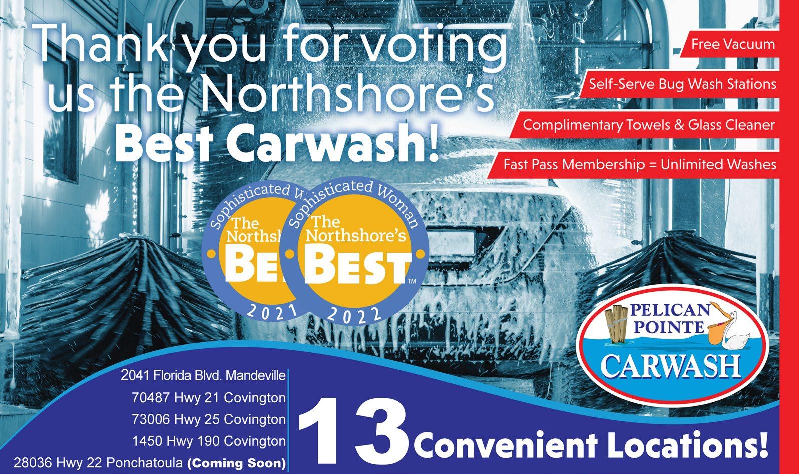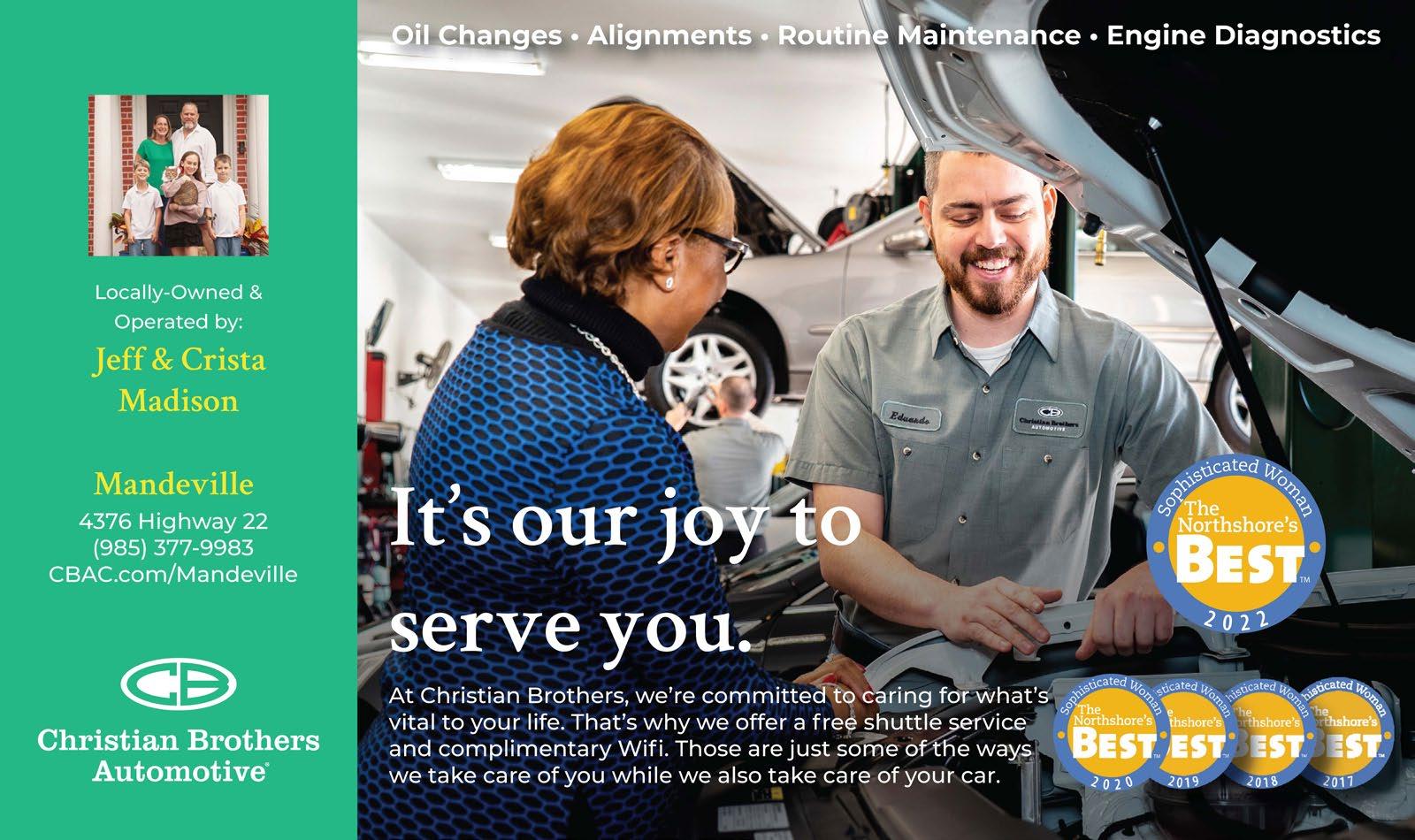 65 The Northshore’s Best | April 2023 The Northshore’s Best Services "Where Service is King" 1340 Front Street | Slidell, LA 70458 985.771.7700 | www.ccwoc.net Best Car Wash in East St. Tammany Thank you for voting us St. Tammany Parish Family-Owned and Operated Owners, Marc & Sarah Delery Where EVERY Car Wash Includes: FREE Towel & Spray Cleaner Use Detail Compressed Air Mat Shampooers Air Freshener All oil changes include our best $20 wash!