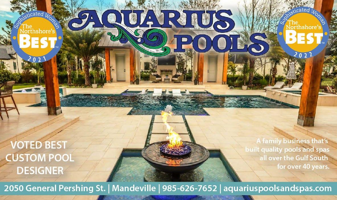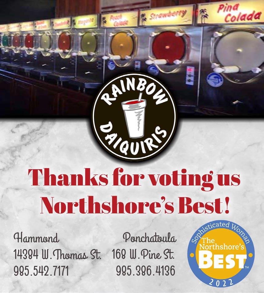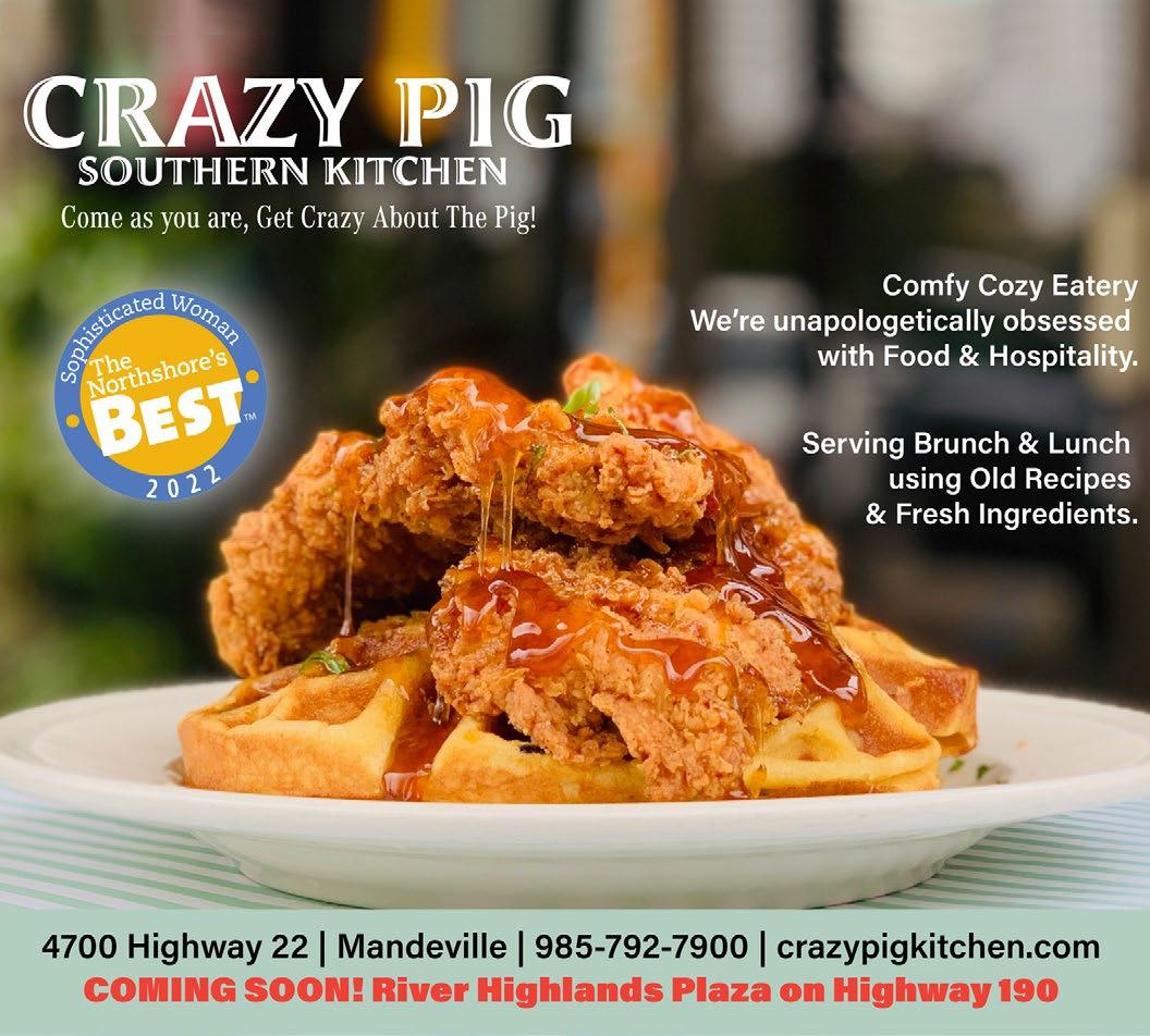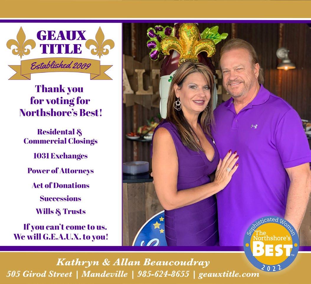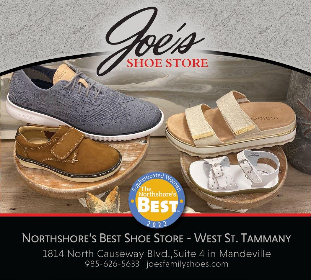 Available at Rouses Markets, Barnes & Noble, and local businesses throughout St.Tammany, Tangipahoa and the Greater New Orleans Area. Sophisticated Woman Magazine 200 Greenleaves Boulevard, Suite 4 Mandeville, LA 70448 985-893-7350 info@sophisticatedwoman.com SophisticatedWoman.com Call us today! You’ll be surprised at how affordable it is to advertise with the best. ©2023 Sophisticated Woman Magazine All rights reserved. No part of this publication may be reproduced without permission of the publisher. Views expressed are not necessarily shared by the publisher or staff of this publication. If you wish to be mailed a one year subscription, please send your name and address with $19.95 for handling. Publisher Lorie Hollis Graphic Design Emily Haik & Pam Hendrix Account Executives Rick Clasen and Lisa Sale Contributing Writer Jan Windhorst Contributing Photographer Steve Randon Production Hollis & Associates Distribution Manager Anthony Figaro Distribution Rouses Danny Sunseri The Northshore's Best Sophisticated Woman Magazine Learn more about the 2022 Northshore's Best Winners. Support local businesses! Open the camera on your smartphone. 1 3 2 When the code’s URL appears, tap to open it. Move the camera so the QR code is in frame. SHOPPING page 20 PEOPLE page 26 SERVICES page 46 RESTAURANTS page 8 NIGHTLIFE page 18 ARTS & ENTERTAINMENT page 70 SPORTS & LEISURE page 73 Felicia Schimpf NEAT Method BEST Home Organizing Service PAMELA EGAN, DNP, CDE Best Holistic Doctor/ Practitioner West St. Tammany ASHLEY GEOGHEGAN DVM, CVA, CVFT, CVCH, CCRT Best Holistic/Specialty Veterinarian West St. Tammany FELICITY KAHN Best Real Estate Agent West St. Tammany HEATHER NEWMAN Best Coach - Personal/Health West St. Tammany REBA WEYMOUTH, FNP-C Best Nurse Practitioner West St. Tammany KATIE KIMBLE WONCH, OD Best Optometrist West St. Tammany Reba Weymouth, FNP-C Heather Newman Felicity Kahn Katie Kimble Wonch, OD Pam Egan, DNP, CDE Ashley C. Geoghegan DVM, CVA, CVFT, CVCH, CCRV Felicia Schimpf NEAT METHOD Best Home Organizing Service BEST Northshore's THE On The Cover