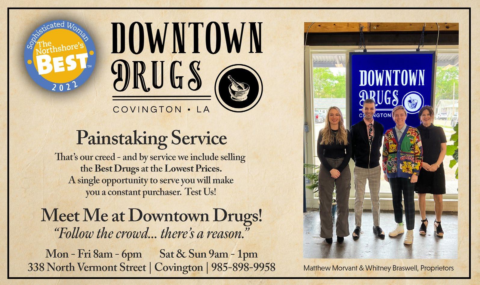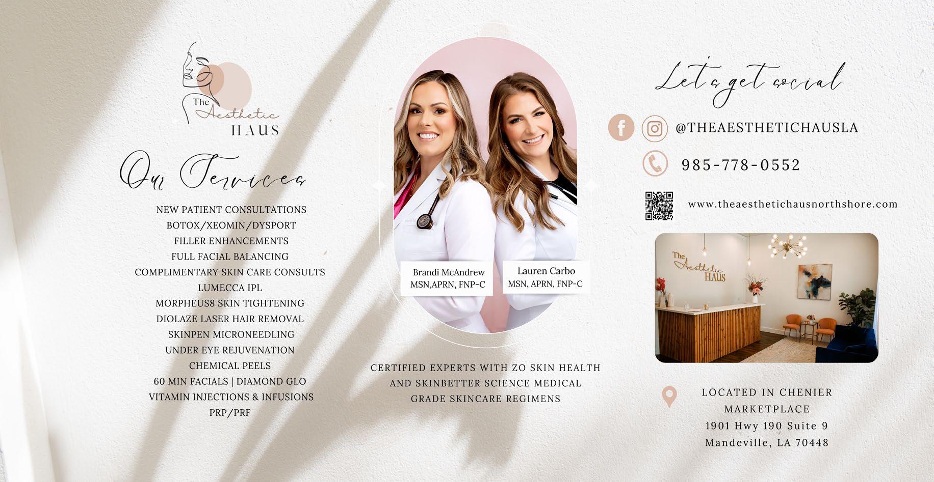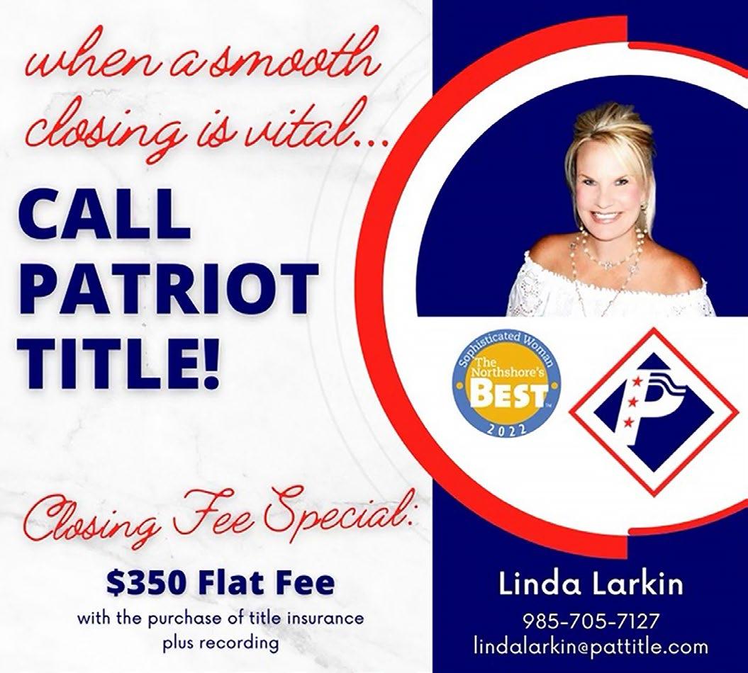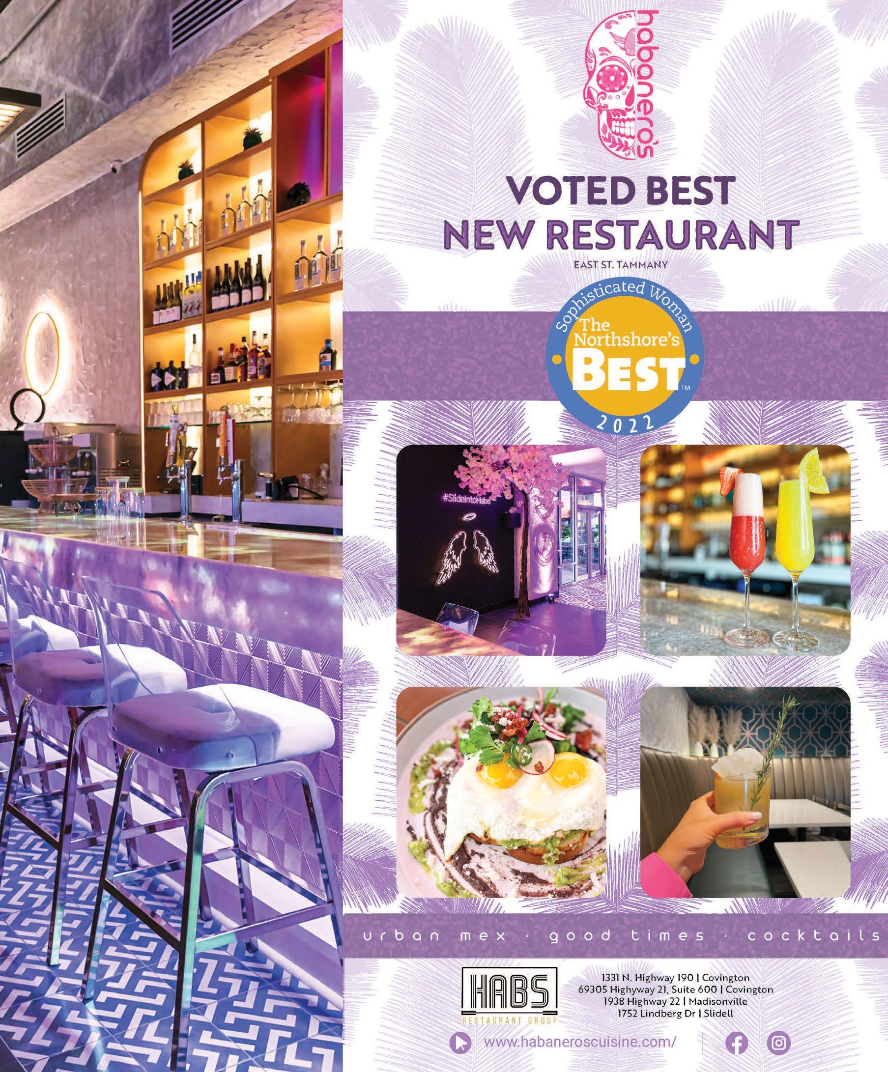 Available at Rouses Markets, Barnes & Noble, and local businesses throughout St.Tammany, Tangipahoa and the Greater New Orleans Area. Sophisticated Woman Magazine 200 Greenleaves Boulevard, Suite 4 Mandeville, LA 70448 985-893-7350 info@sophisticatedwoman.com SophisticatedWoman.com Call us today! You’ll be surprised at how affordable it is to advertise with the best. ©2023 Sophisticated Woman Magazine All rights reserved. No part of this publication may be reproduced without permission of the publisher. Views expressed are not necessarily shared by the publisher or staff of this publication. If you wish to be mailed a one year subscription, please send your name and address with $19.95 for handling. Publisher Lorie Hollis Graphic Design Emily Haik & Pam Hendrix Account Executives Rick Clasen and Lisa Sale Contributing Writer Jan Windhorst Contributing Photographer Steve Randon Production Hollis & Associates Distribution Manager Anthony Figaro Distribution Rouses Danny Sunseri The Northshore's Best Sophisticated Woman Magazine Learn more about the 2022 Northshore's Best Winners. Support local businesses! Open the camera on your smartphone. 1 3 2 When the code’s URL appears, tap to open it. Move the camera so the QR code is in frame. SHOPPING page 20 PEOPLE page 26 SERVICES page 46 RESTAURANTS page 8 NIGHTLIFE page 18 ARTS & ENTERTAINMENT page 70 SPORTS & LEISURE page 73 Felicia Schimpf NEAT Method BEST Home Organizing Service PAMELA EGAN, DNP, CDE Best Holistic Doctor/ Practitioner West St. Tammany ASHLEY GEOGHEGAN DVM, CVA, CVFT, CVCH, CCRT Best Holistic/Specialty Veterinarian West St. Tammany FELICITY KAHN Best Real Estate Agent West St. Tammany HEATHER NEWMAN Best Coach - Personal/Health West St. Tammany REBA WEYMOUTH, FNP-C Best Nurse Practitioner West St. Tammany KATIE KIMBLE WONCH, OD Best Optometrist West St. Tammany Reba Weymouth, FNP-C Heather Newman Felicity Kahn Katie Kimble Wonch, OD Pam Egan, DNP, CDE Ashley C. Geoghegan DVM, CVA, CVFT, CVCH, CCRV Felicia Schimpf NEAT METHOD Best Home Organizing Service BEST Northshore's THE On The Cover