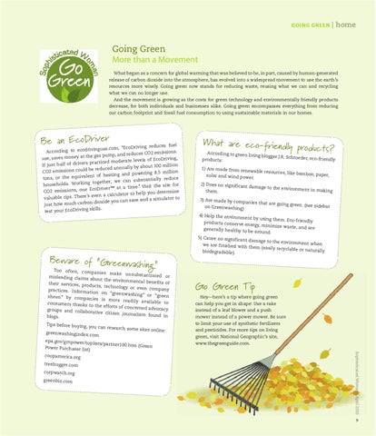 Hey—here’s a tip where going green can help you get in shape: Use a rake instead of a leaf blower and a push mower instead of a power mower. Be sure to limit your use of synthetic fertilizers and pesticides. For more tips on living green, visit National Geographic’s site, www.thegreenguide.com. Sophisticated Woman | April 2010