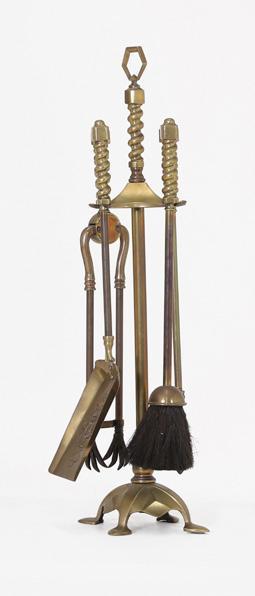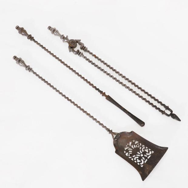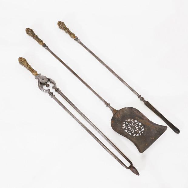 A set of three brass and steel fire irons, 19th century, comprising a shovel, tongs and poker, each with a brass handle and plain shaft, shovel 79cm long (3)