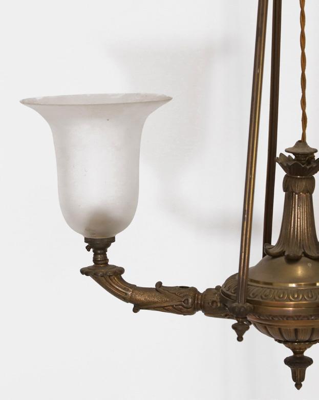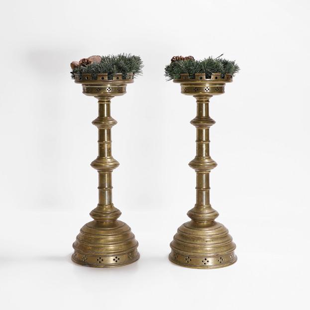 A pair of large Victorian brass altar sticks, each of knopped form with pierced decoration, on a circular stepped base, converted to electricity, 97cm high overall (2)