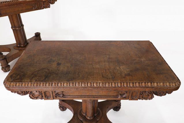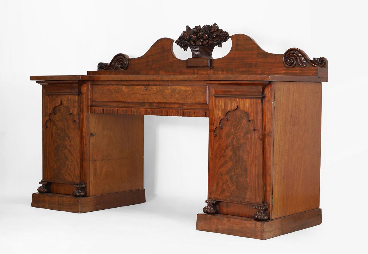 A George IV mahogany console table, c.1825, the veined marble top raised on boldly carved and scrolled front legs, terminating in paw feet, 137cm wide