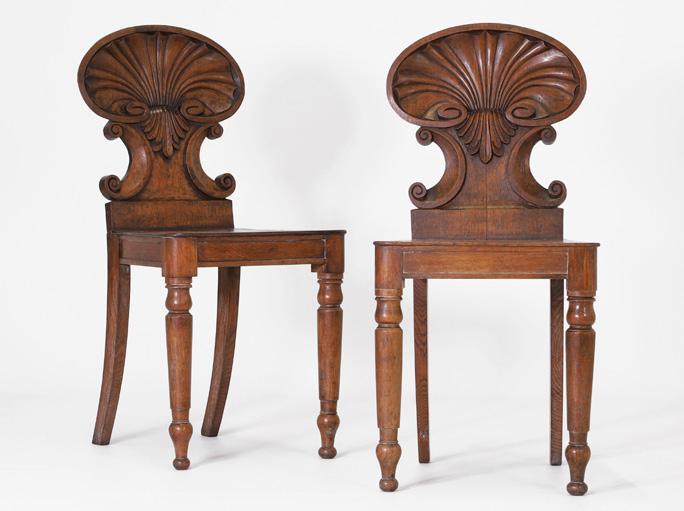 A pair of Regency mahogany hall chairs, in the manner of Gillows of Lancaster, each with a carved and waisted back over a solid seat, on turned tapering front legs,