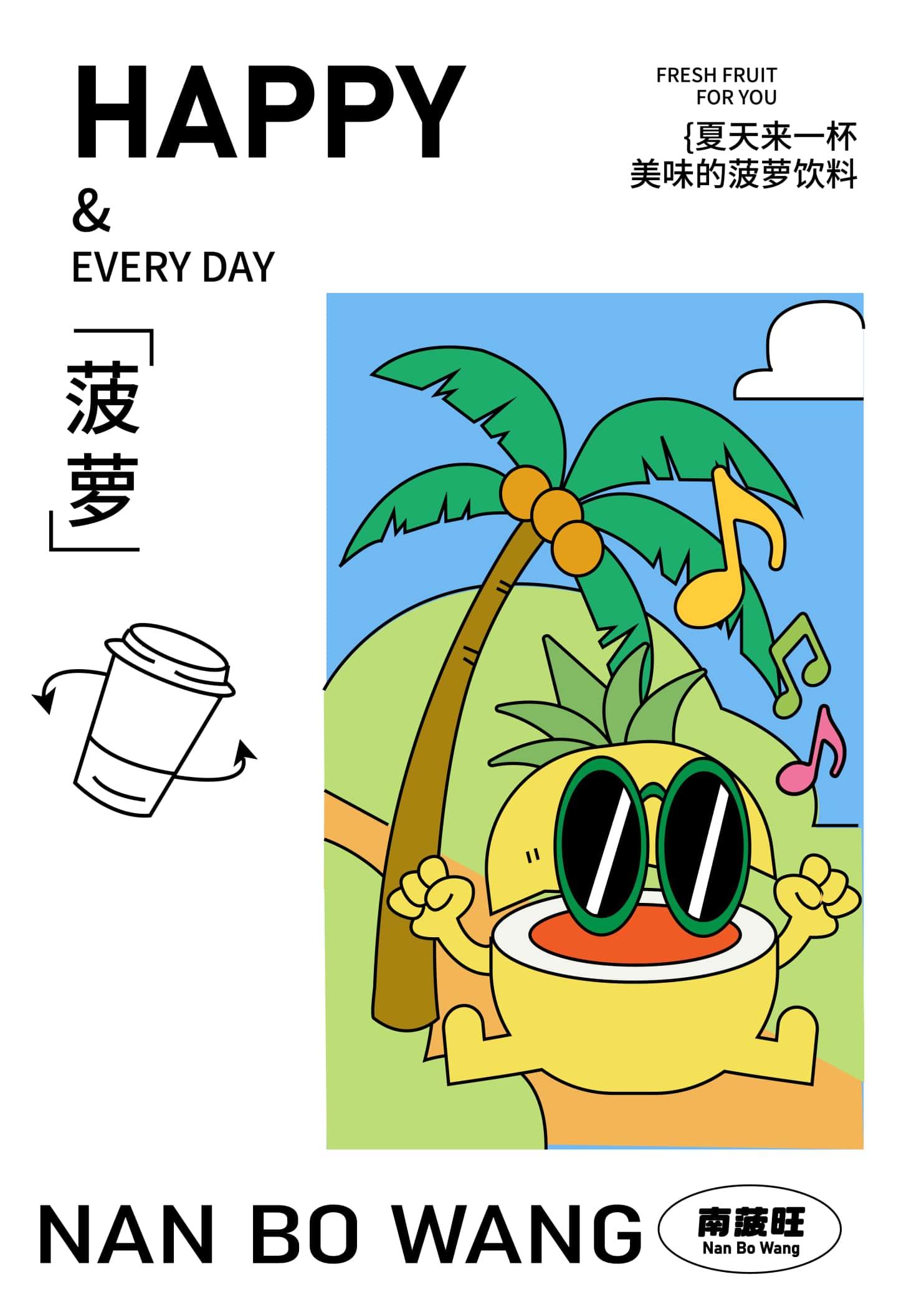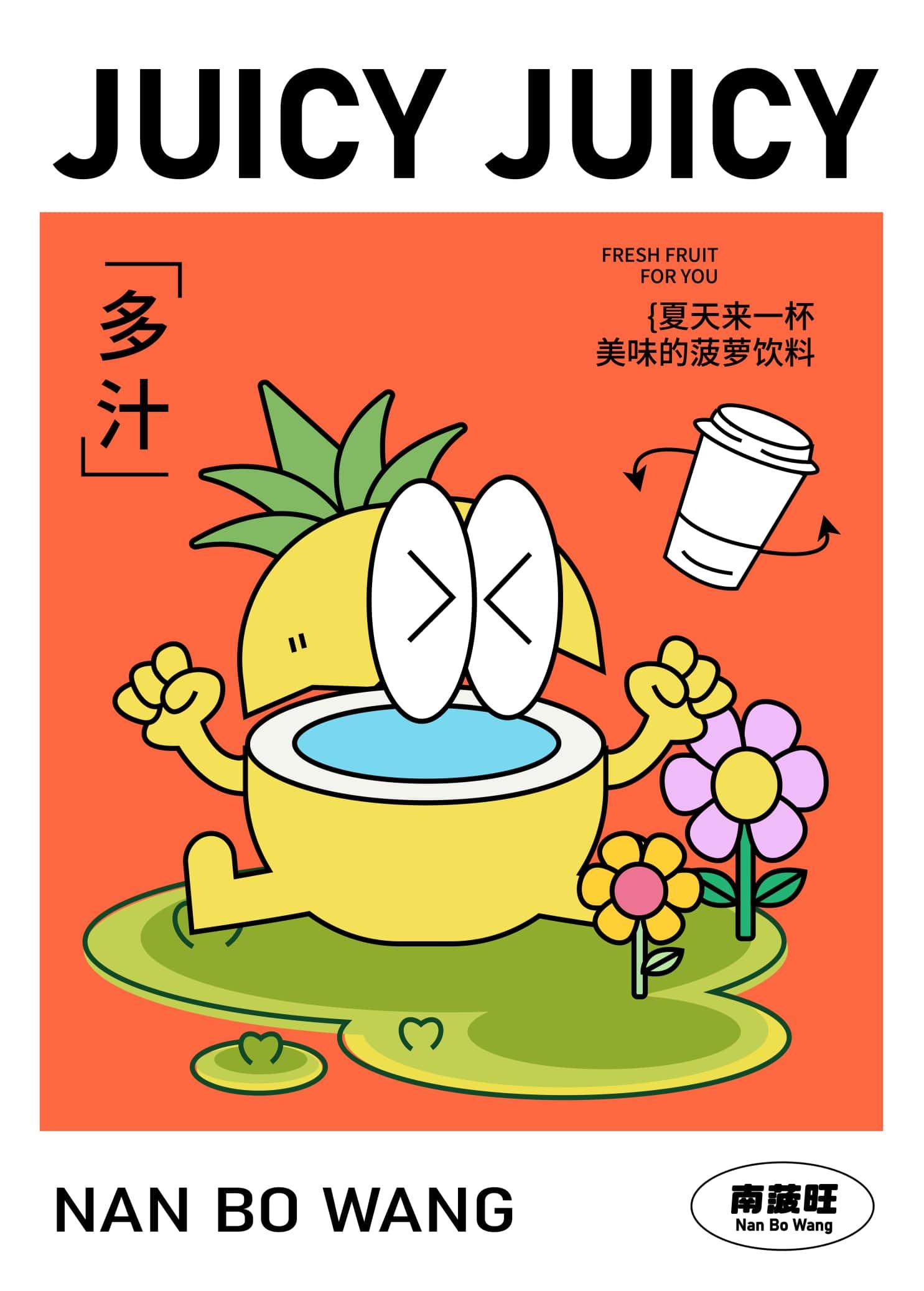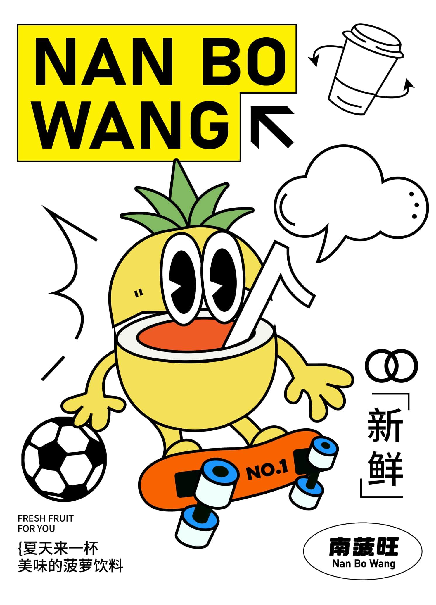 南菠旺打造一个勇敢、热爱运动的小菠萝,通过不同的场景描绘小菠萝不同的 生活场景。让小菠萝给每个人带来力量,传递勇气与快乐,南菠旺提供这种明 媚、元气的空间在炎炎夏日、运动完的你喝上一杯菠萝饮料。