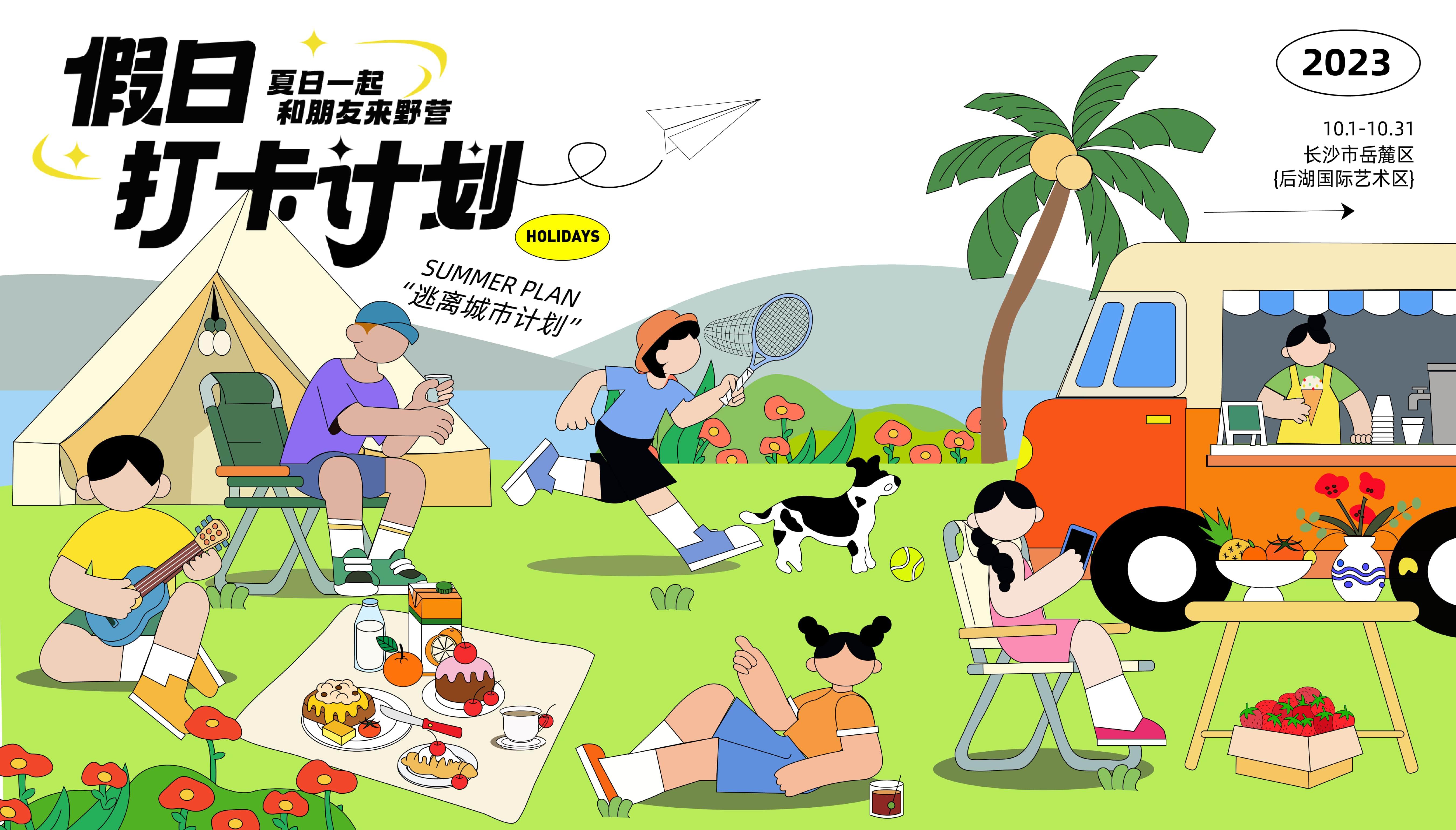主题为夏日野餐,在这生机盎然的季节,人们来到这块草坪上游玩,草地上的鲜花的鲜 花点缀着人们。每个人都有自己的小领地,有的两三人围坐在一起,听着朋友的吉他声 ,边品尝着手里的饮料。或者是高谈阔论的聊着自己的生活日常哈哈大笑。也有人独自 坐在一旁,桌子上摆着刚送来的水果,花瓶中插着采来的鲜花,用手机记录着这令人陶 醉的一刻。当然也有追逐风奔跑的男孩和自己的小狗Mike。每一个幸福且温馨的画面这 一刻都被具象化的描绘出来。谁看了不动心呢!
