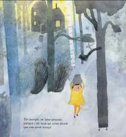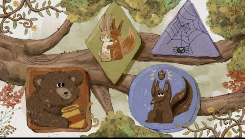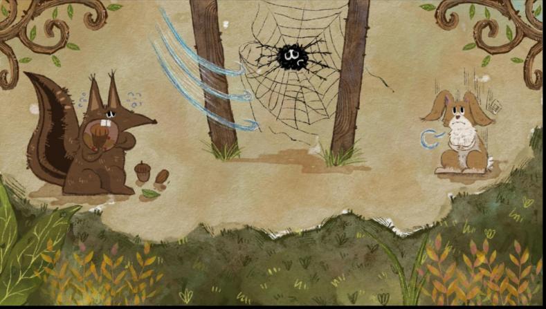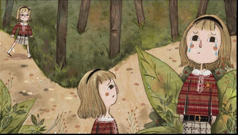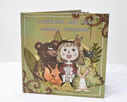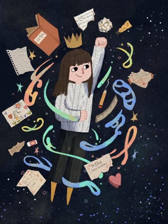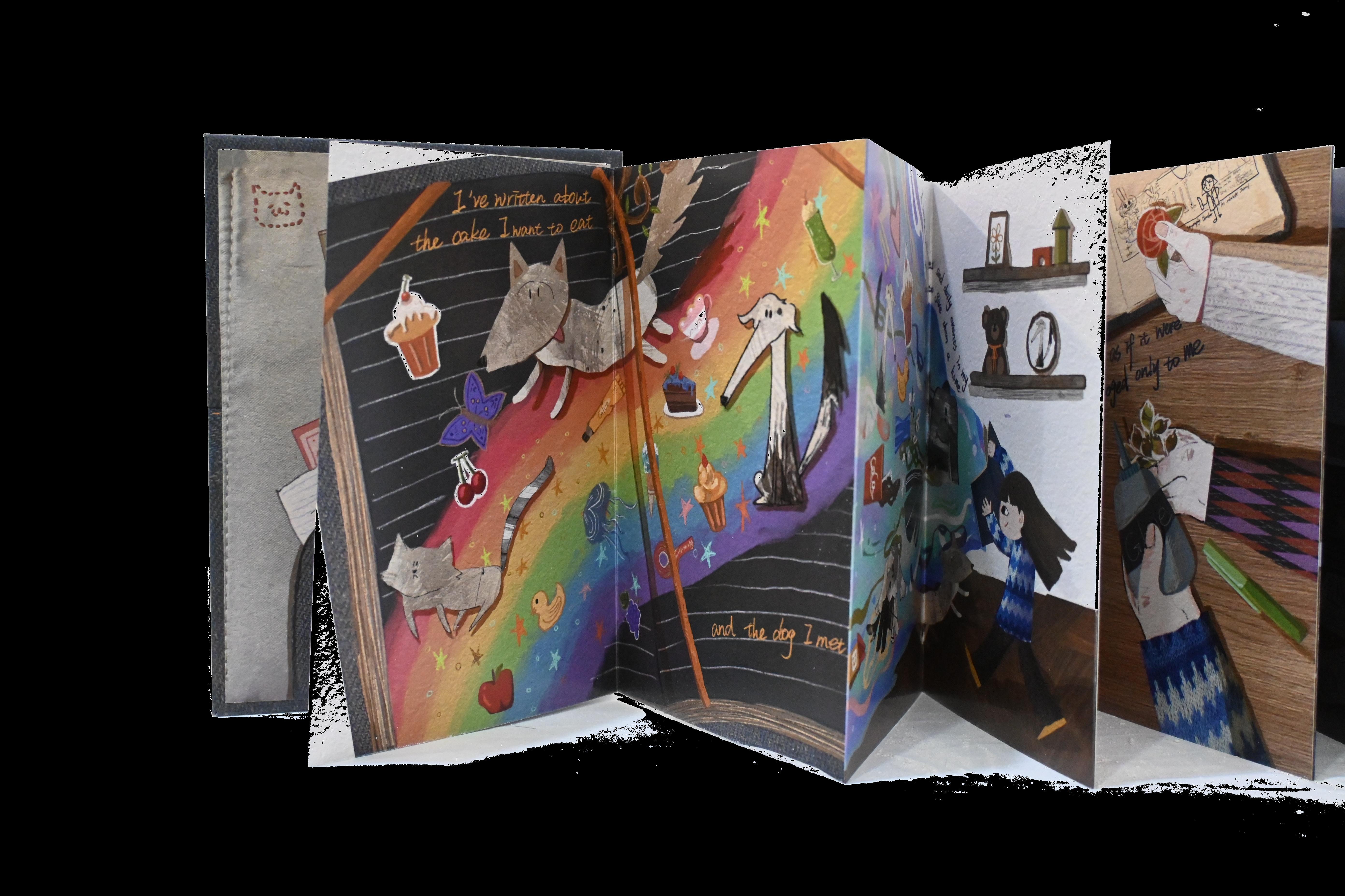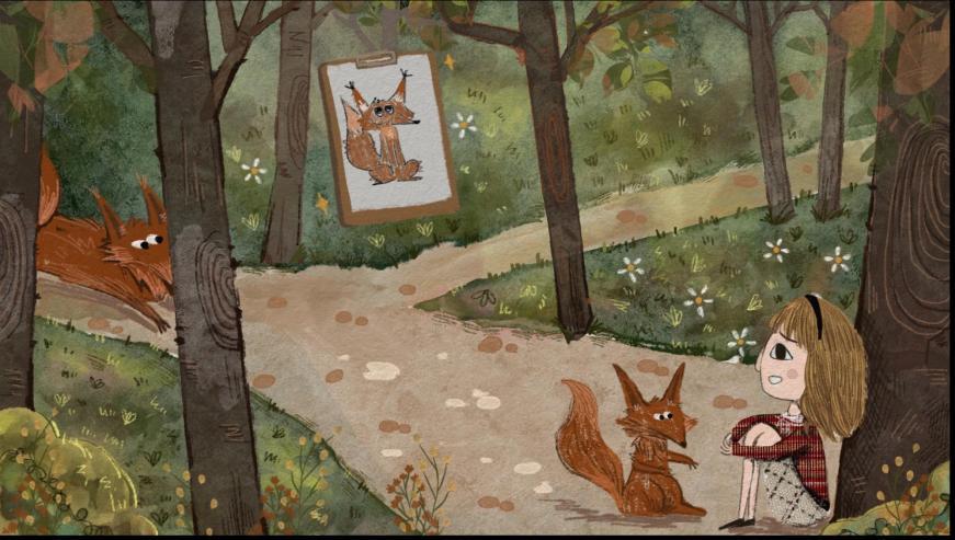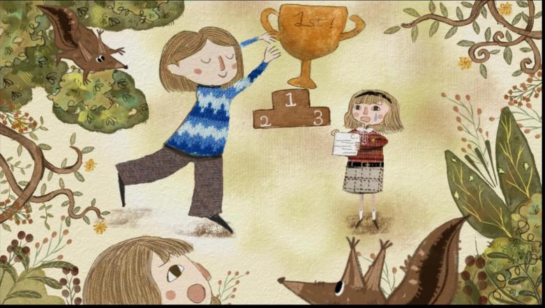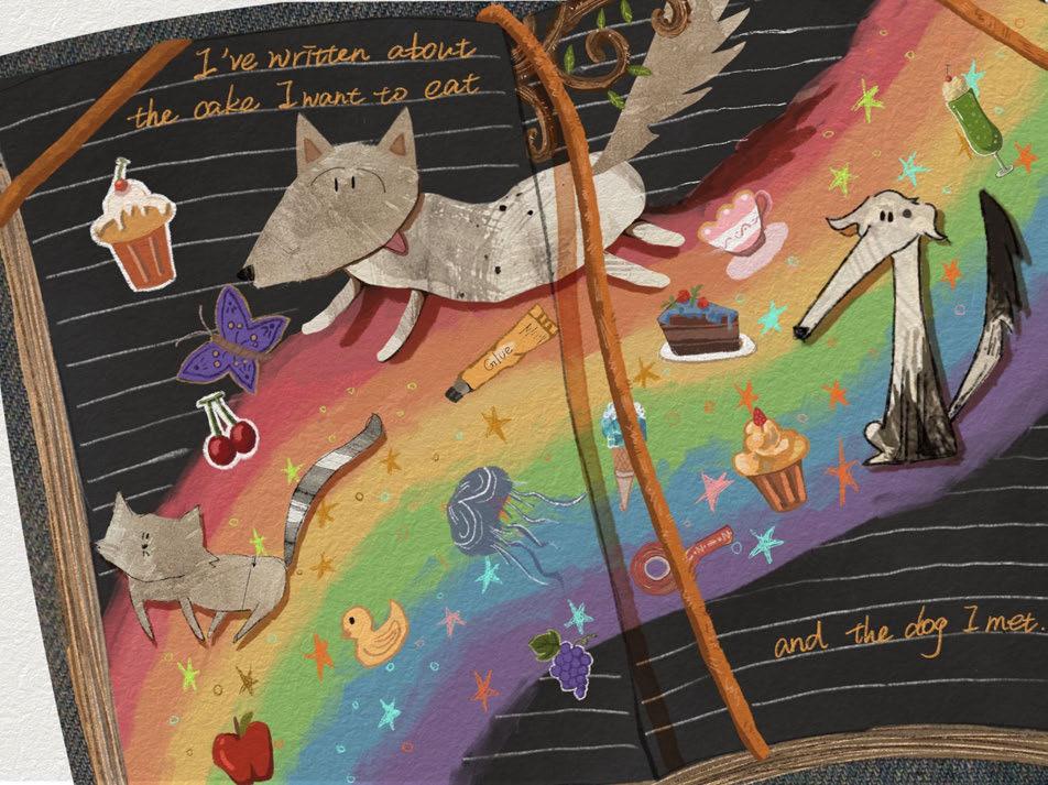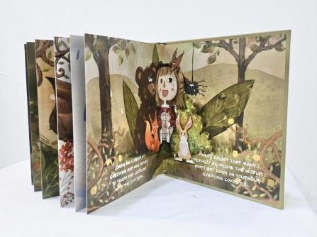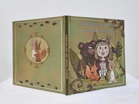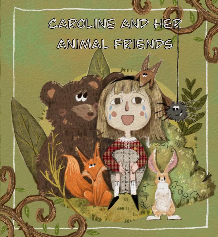 Watercolourisusedextensivelyinthiswork,withanoverall warmgreentoneandasmallamountofcollageasthemain characterCaroline'sTheoverallcolourpaletteiswarmgreen, withalittlecollageasthemaincharacterCaroline'sclothes. Thesmallanimalsareportrayedinafluffytexture, togiveasenseofhopeandwarmthwhenIpainted