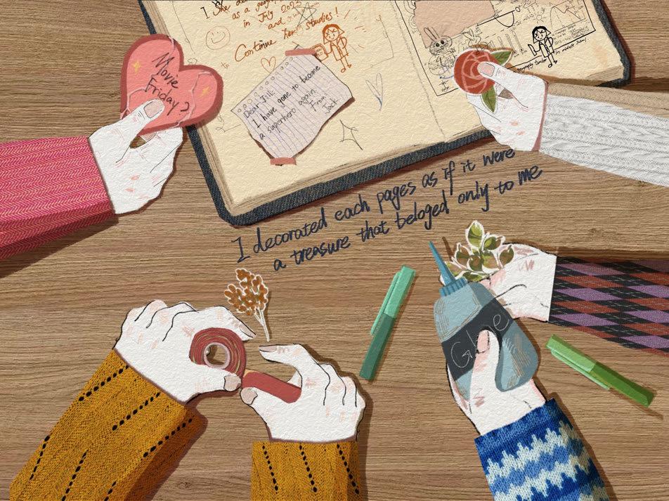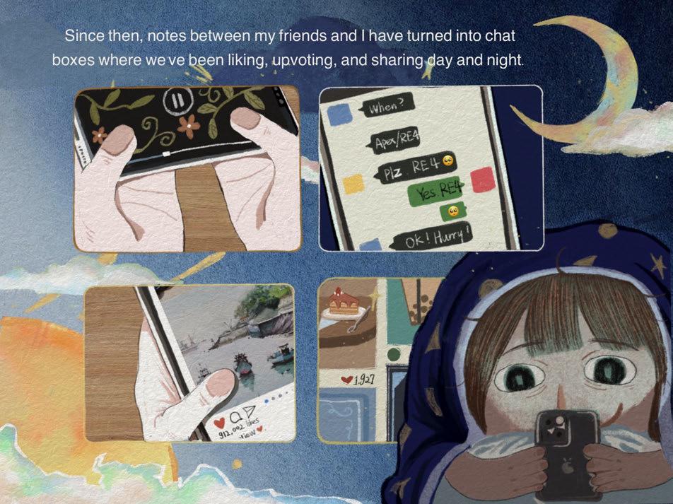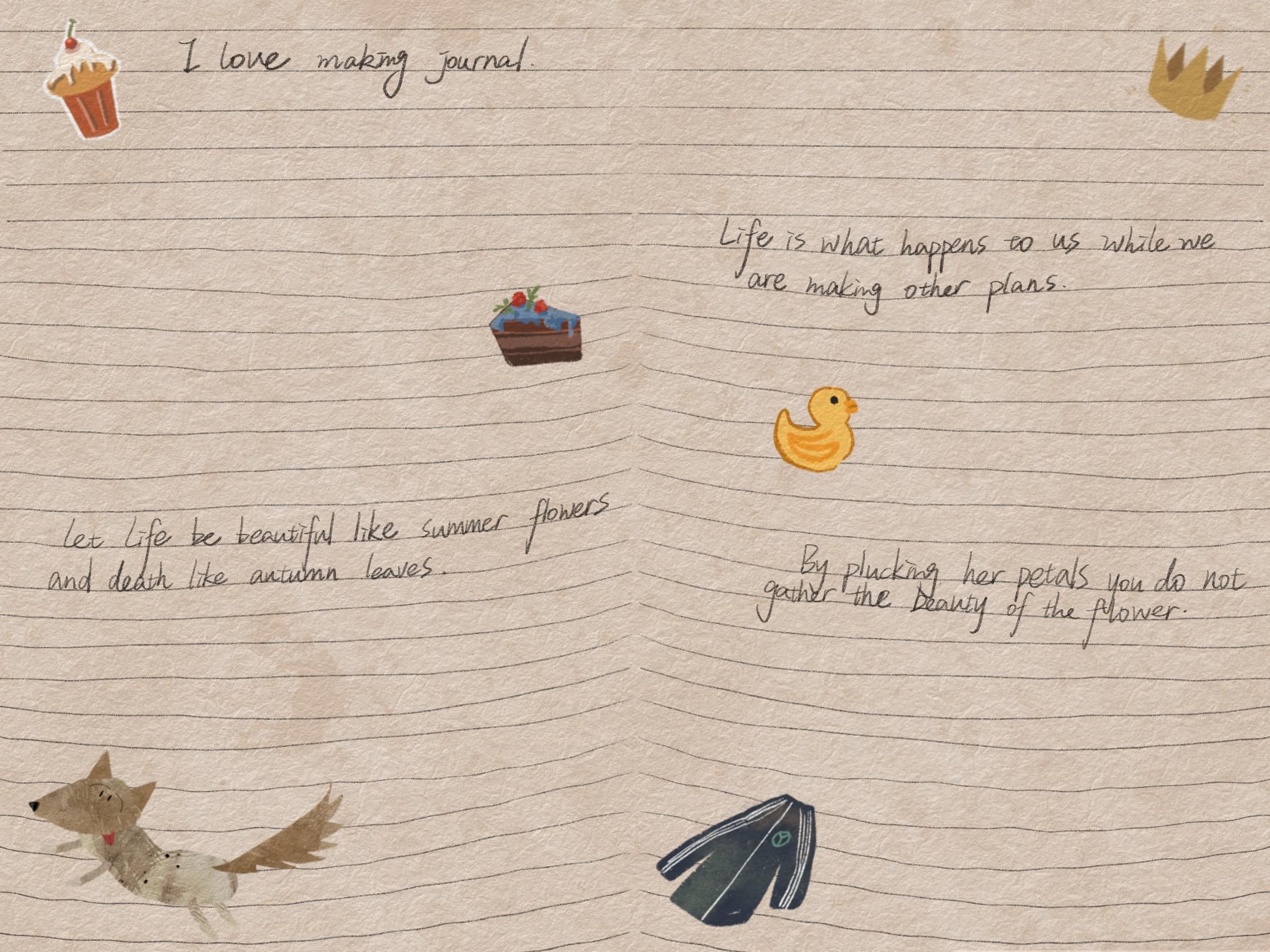 Thisprojectdocumentsaperiodofmyexperiencewith journaling,knownas"手帐"(shǒuzhàng)inChinese. Journaling,intheformofcreatingapersonalizeddiary,involves expressingdailythoughtsandexperiencesthroughwriting, drawing,andaddingfavoritephotosorstickerstothejournal. Ittransformsmymemoriesintotangiblerecords,capturingthe essenceofeachday'shighlights.However,myroutinechanged whenmydadgiftedmeamobilephone.Gradually,mydaily lifebecameinseparablefromthephone,whetherforleisure, entertainment,orshopping.Everyaspectoflifewas meticulouslyrecordedbythephone,renderingmyattempts tocontinuetraditionalpen-and-paperjournalingunsuccessful. Thecontentthatusedtofillmyjournalwasreducedto sporadicwordsonthephone,leavingmeincreasingly uncertainaboutwhattodocument.Thisdilemmaledtoa profoundsenseofconfusionabouttheroleofboththephone andthetraditionaljournalinmylife,andIhopetooneday breakfreefromthisconfusion.