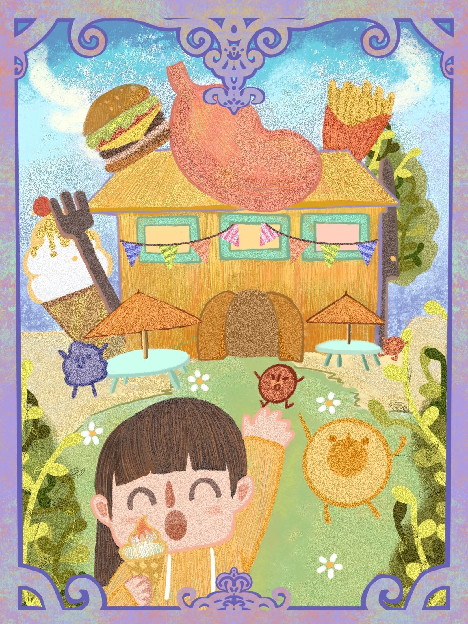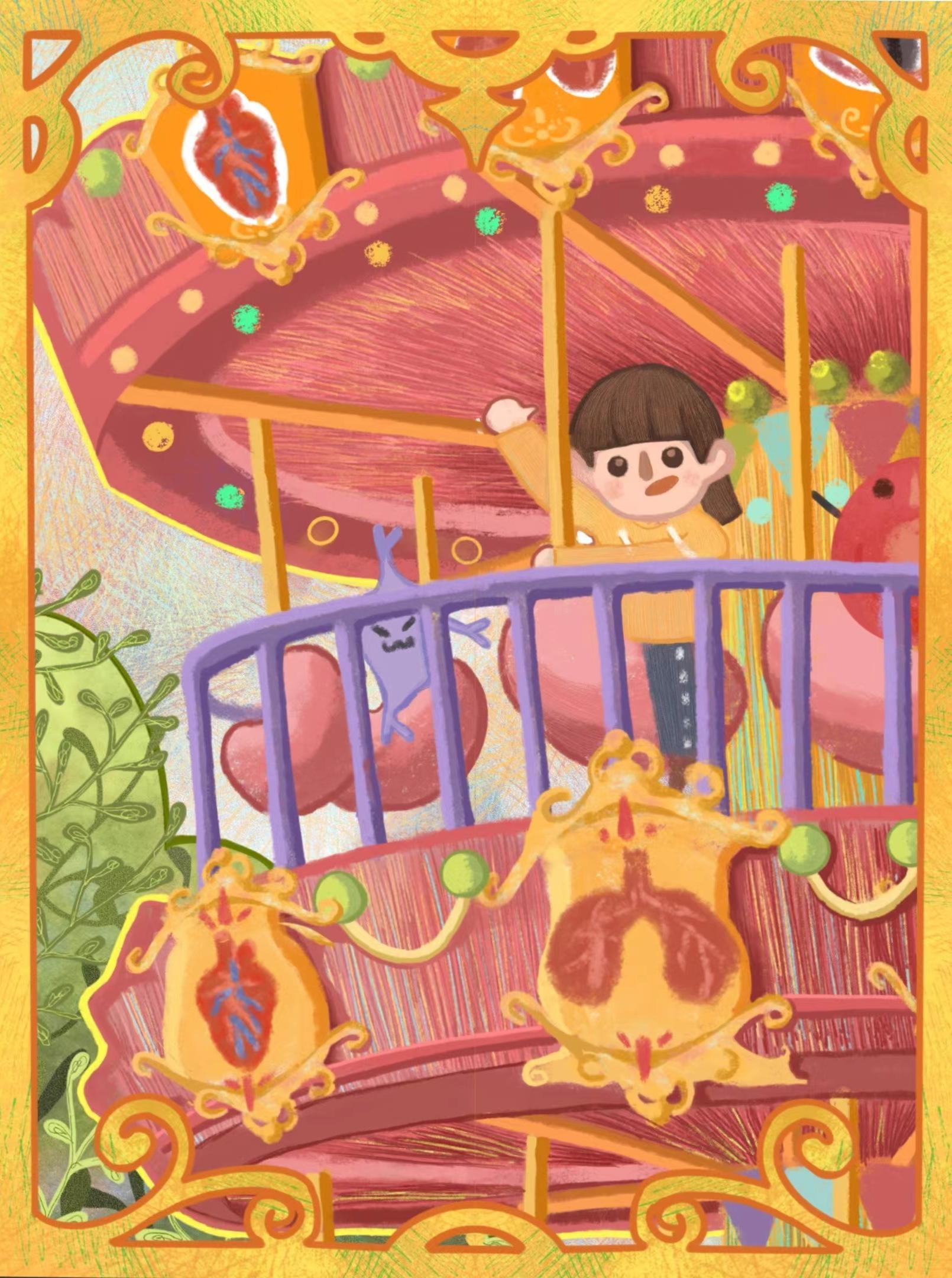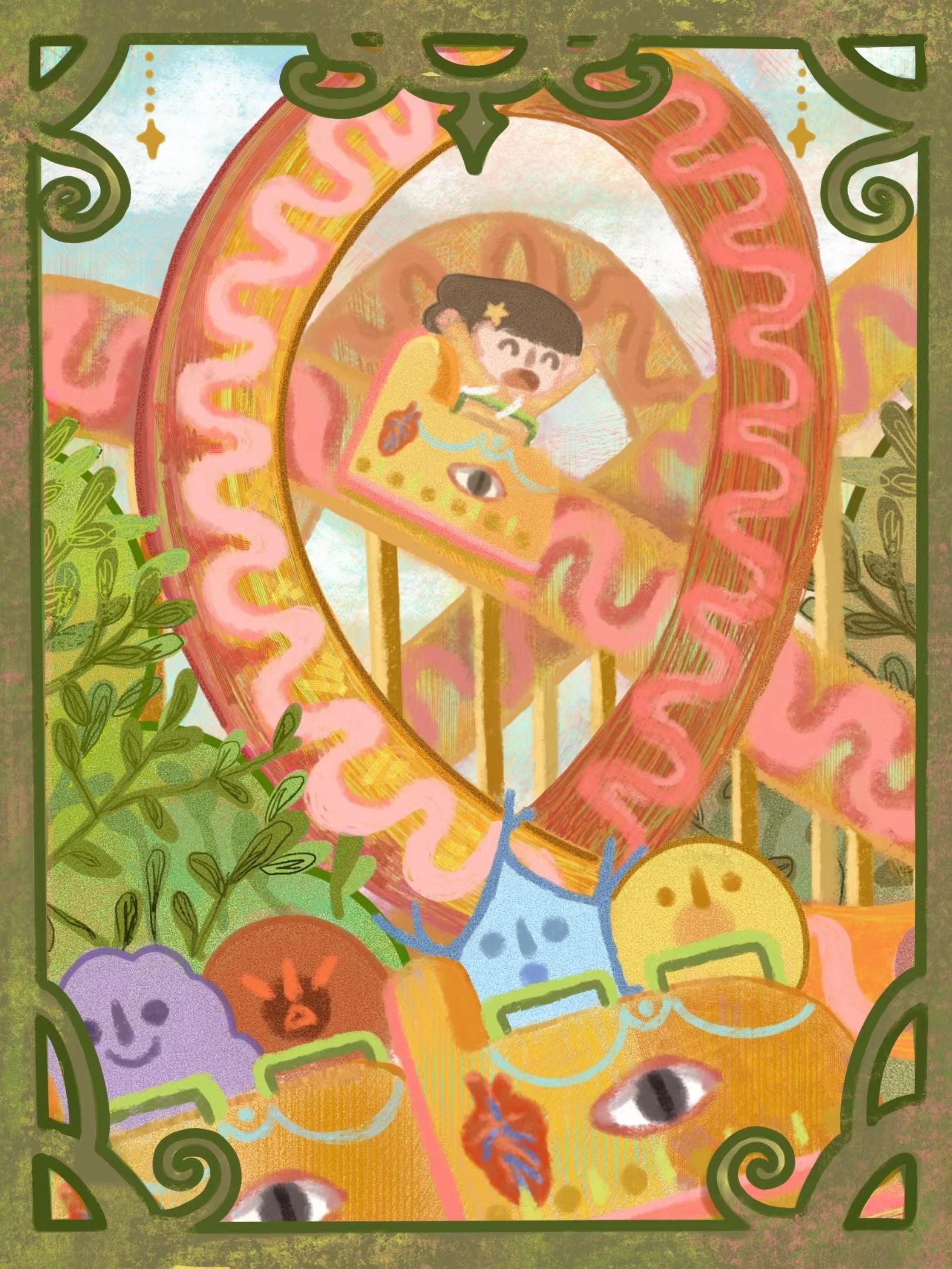 Myworkusesastylesimilartothe illustrationofapicturebookasan expression,expressingmyself-regulation ofmybademotions.Bycomparingthe humanbodytoaplayground,whenIplayin the"playground",Iamactuallycomparing ittotheprocessofregulatingmyown emotions,andwhenthehumanbodyis regulatingitsownemotions,alltheorgans ofthebodyarerunning,andeachorgan representsaride,forexample,theuterus inagirl'sbodyrepresentsagiftstore,the intestinesrepresentarollercoaster,etc.