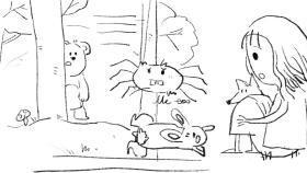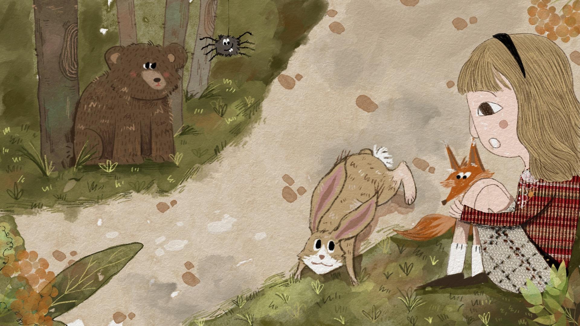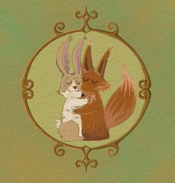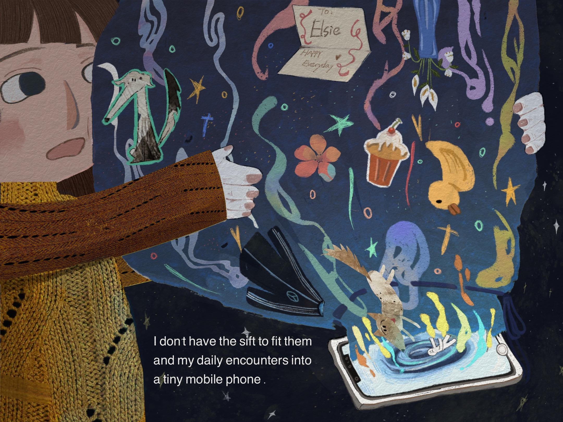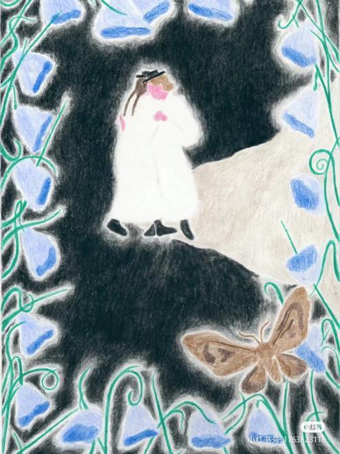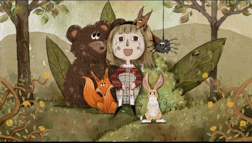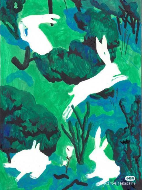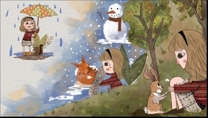 Watercolourisusedextensivelyinthiswork,withanoverall warmgreentoneandasmallamountofcollageasthemain characterCaroline'sTheoverallcolourpaletteiswarmgreen, withalittlecollageasthemaincharacterCaroline'sclothes. Thesmallanimalsareportrayedinafluffytexture, togiveasenseofhopeandwarmthwhenIpainted