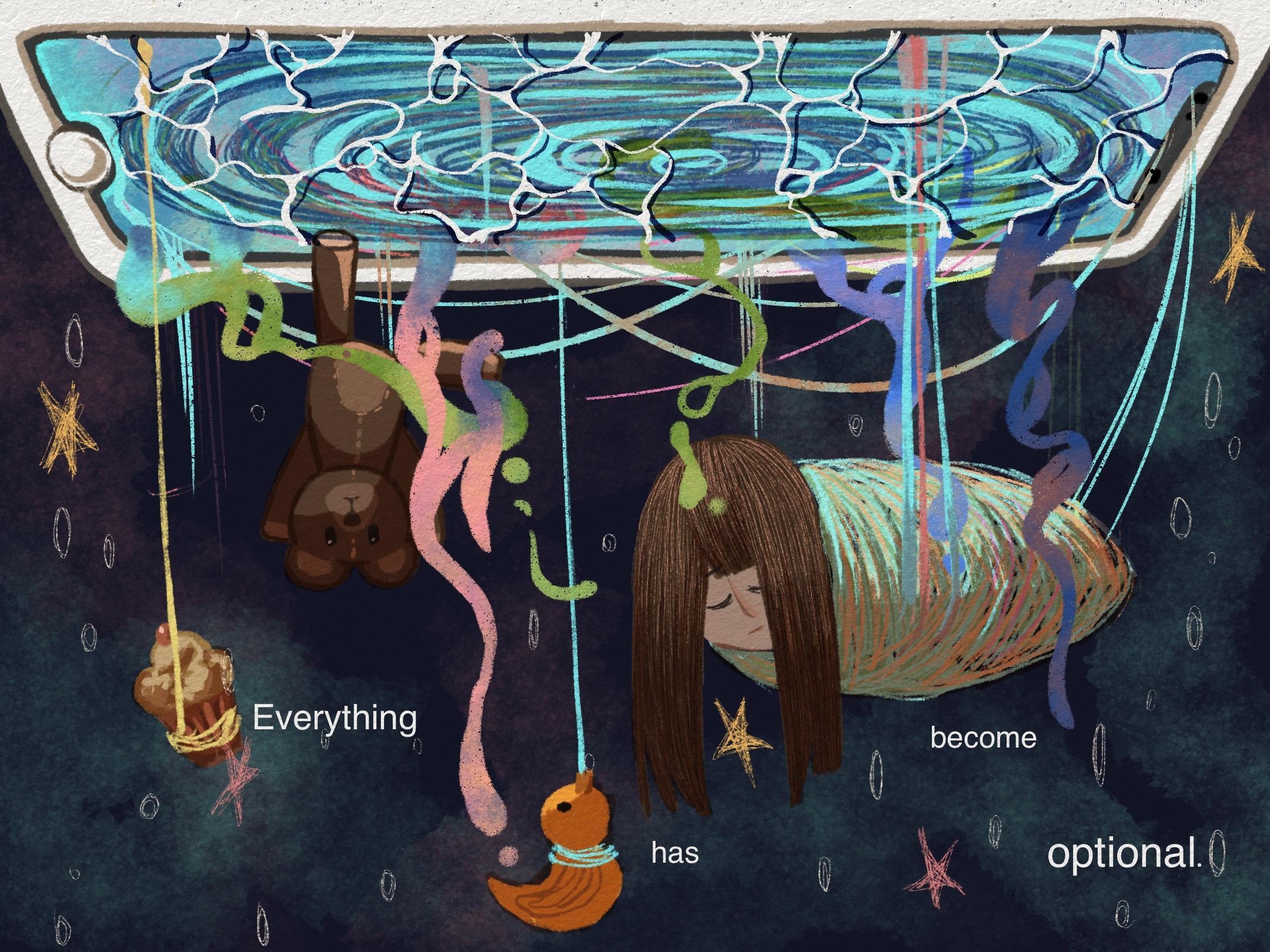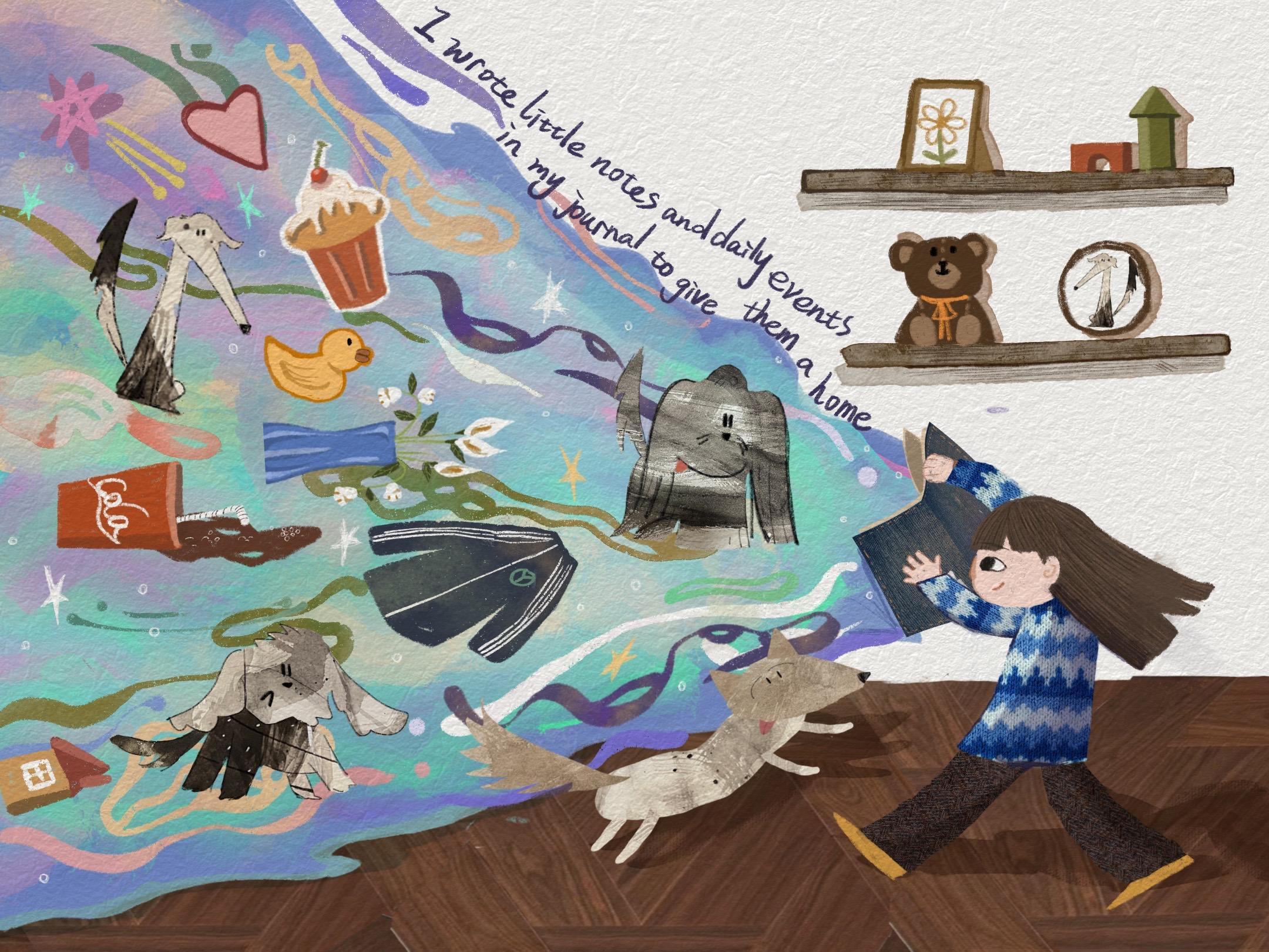 Myworkisinfluencedby severalartistssuchas PhilipLindeman,Kaja Meyer,andfirecrackercitv, andIhavecombinedthe painterlyexpressionsof severalartiststocreate mywork.Mypurposein usingtheseformsof expressionisbecauseI personallylikethestyleof picturebookcreation,and Iwantedtoexpressmy processofresistingpain inalesssadway.