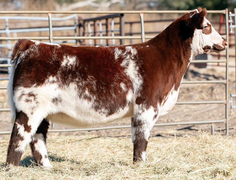 We were lucky enough to find this Lot 1 heifer for the Schmidt Family last year, who successfully campaigned her to multiple champion banners. Monster bodied and boned, wide made, cool necked, level hipped and shaggy haired. Talk about future donor potential! We think she will raise both steers and heifers. She’s clubby bred but has a maternal look, awesome running gear, and a flashy color pattern. If you’re serious about a future donor, whip and spur on this one!