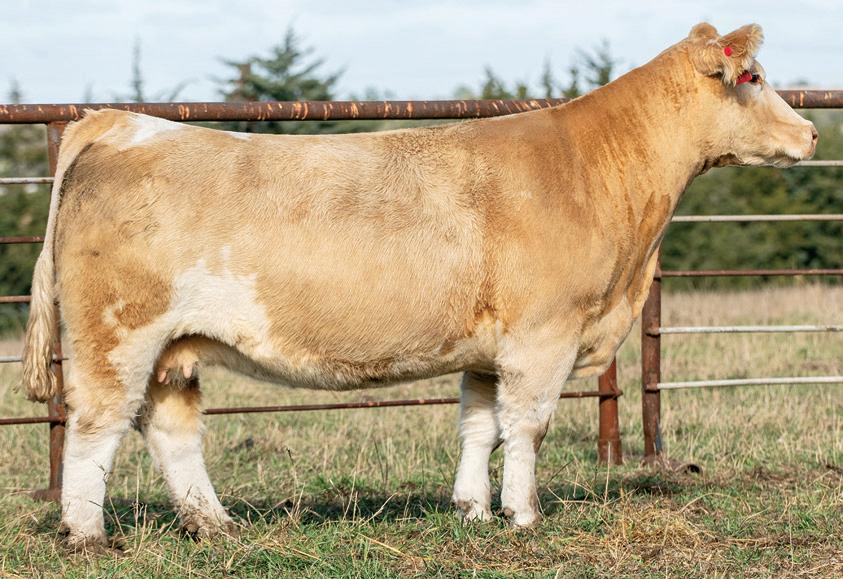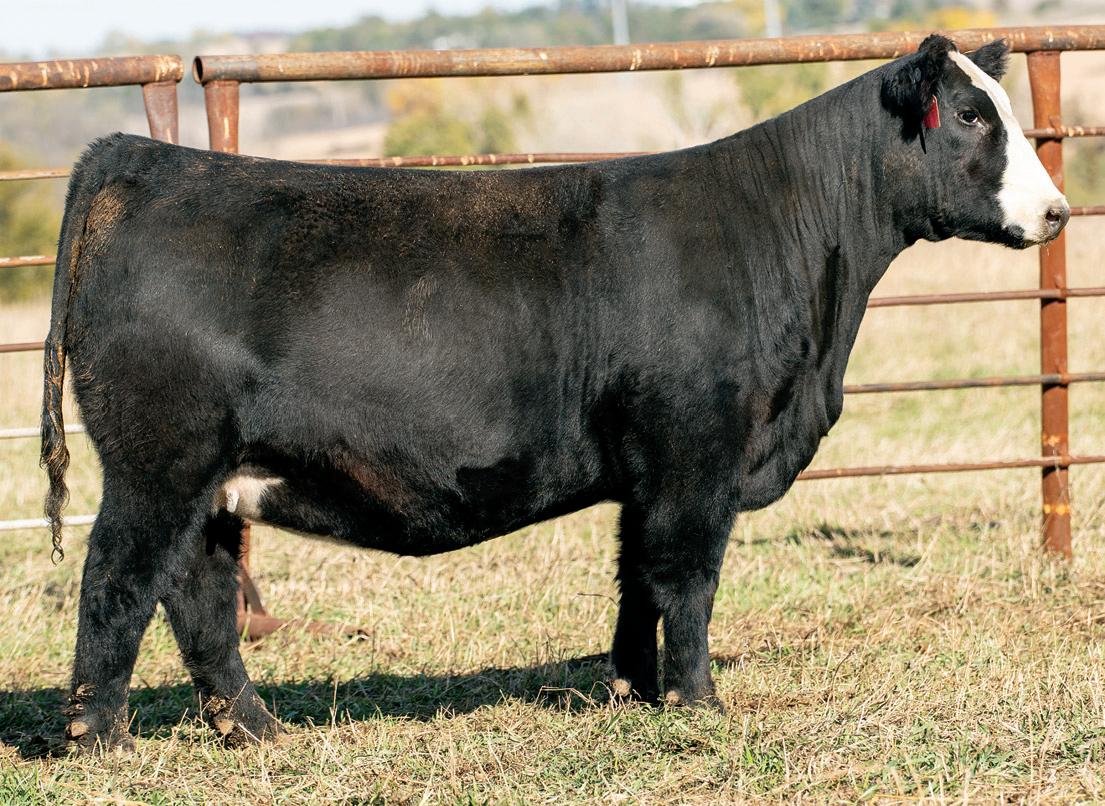 Melania has been a staple for our and AK’s programs, and we might have the best daughter yet right here. Noem commands your attention with her presence and eye appeal the moment you lay eyes on her. This heifer is as good in her front third as any Simmental to sell this fall— jet neck that ties high out of her shoulder, flat in her blade, and goes to the ground like one should. For as out there as she is in her neck and head set, she backs it up with bold rib shape, flawless structure, and big foot and bone. The ceiling is incredibly high here!