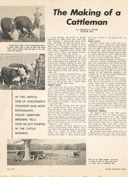 Vince and Mildred Huth needed to get their mischievous 11-year-old son a job to get him off the streets of Oakfield. Dad rented a barn from the vegetable canning factory (which he managed) and gave me the job of taking care of three Black Angus heifers. I enjoyed the work but not the wild Angus heifers. We quickly switched to Polled Herefords because of no horns, great disposition, and their pretty white heads. I showed a heifer at the county fair and stood last in class.